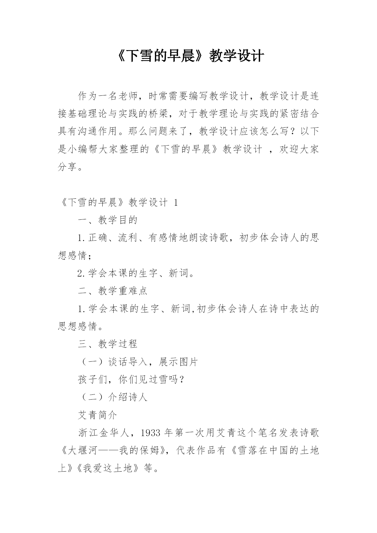 《下雪的早晨》教学设计作为一名老师,时常需要编写教学设计,教学设计是连接基础理论与实践的桥梁,对于教学理论与实践的紧密结合具有沟通作用。那么问题来了,教学设计应该怎么写?以下是小编帮大家整理的《下雪的早晨》教学设计,欢迎大家分享。《下雪的早晨》教学设计1一、教学目的1.正确、流利、有感情地朗读诗歌,初步体会诗人的思想感情;2.学会本课的生字、新词。二、教学重难点1.学会本课的生字、新词,初步体会诗人在诗中表达的思想感情。三、教学过程(一)谈话导入,展示图片孩子们,你们见过雪吗?(二)介绍诗人艾青简介浙江金