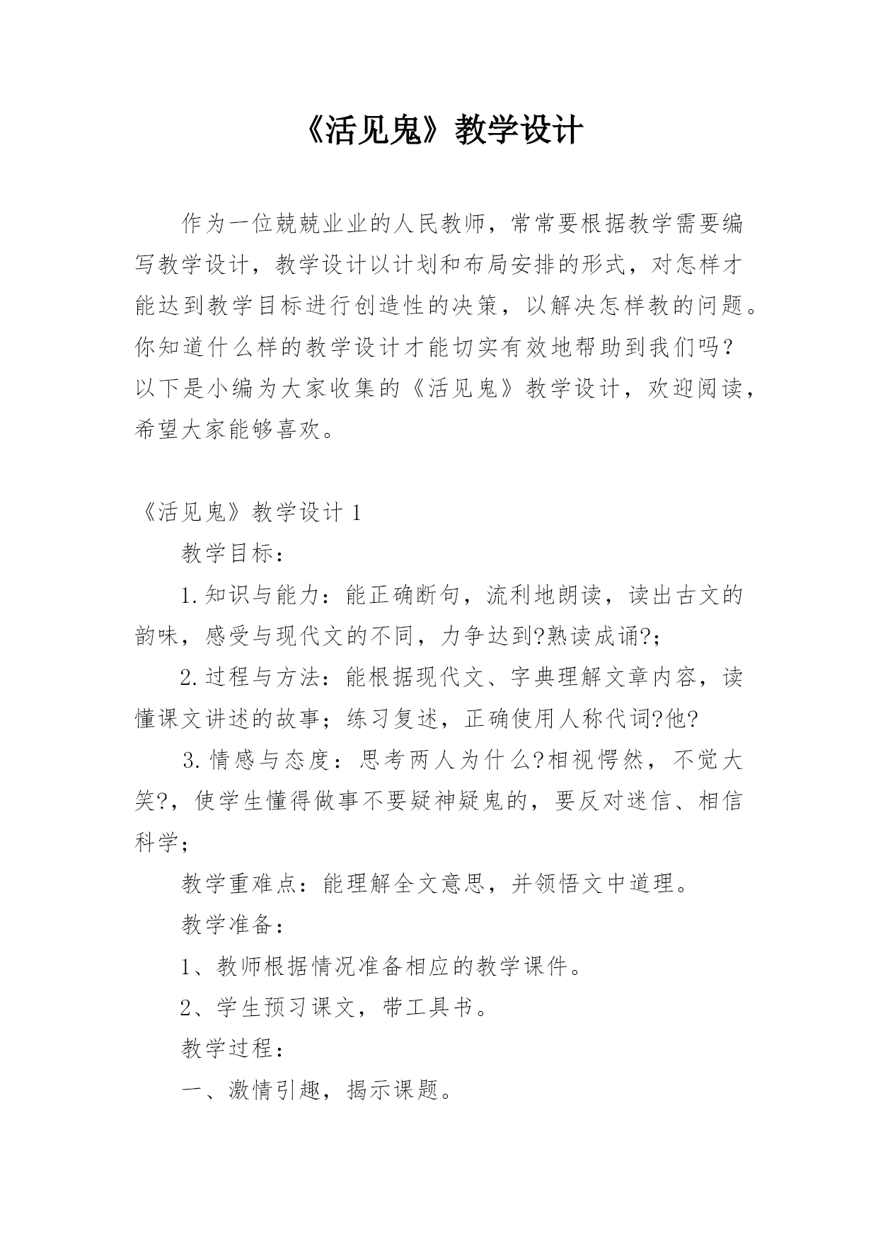 《活见鬼》教学设计作为一位兢兢业业的人民教师,常常要根据教学需要编写教学设计,教学设计以计划和布局安排的形式,对怎样才能达到教学目标进行创造性的决策,以解决怎样教的问题。你知道什么样的教学设计才能切实有效地帮助到我们吗?以下是小编为大家收集的《活见鬼》教学设计,欢迎阅读,希望大家能够喜欢。《活见鬼》教学设计1教学目标:1.知识与能力:能正确断句,流利地朗读,读出古文的韵味,感受与现代文的不同,力争达到?熟读成诵?;2.过程与方法:能根据现代文、字典理解文章内容,读懂课文讲述的故事;练习复述,正确使用人称代