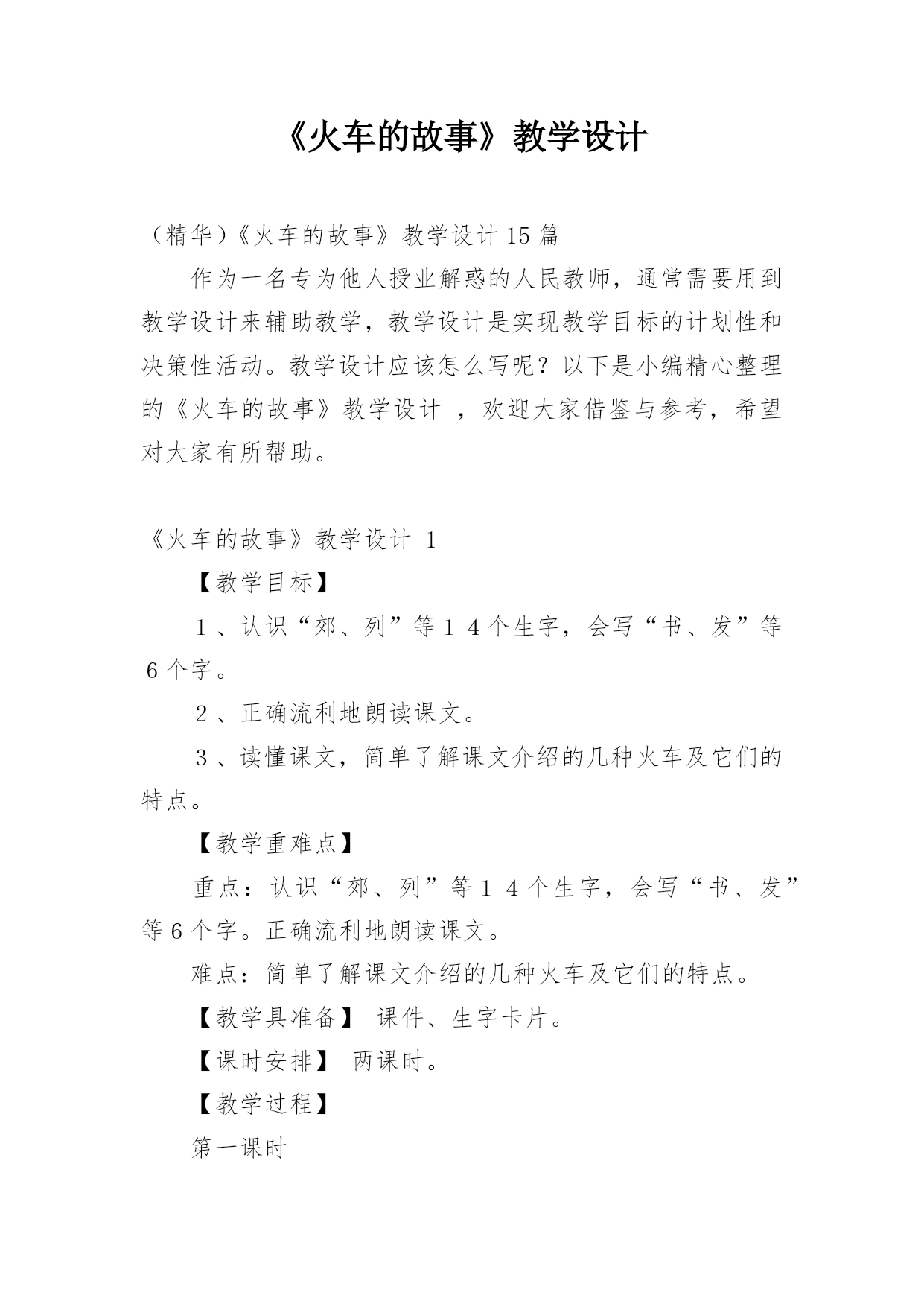 《火车的故事》教学设计(精华)《火车的故事》教学设计15篇作为一名专为他人授业解惑的人民教师,通常需要用到教学设计来辅助教学,教学设计是实现教学目标的计划性和决策性活动。教学设计应该怎么写呢?以下是小编精心整理的《火车的故事》教学设计,欢迎大家借鉴与参考,希望对大家有所帮助。《火车的故事》教学设计1【教学目标】1、认识“郊、列”等14个生字,会写“书、发”等6个字。2、正确流利地朗读课文。3、读懂课文,简单了解课文介绍的几种火车及它们的特点。【教学重难点】重点:认识“郊、列”等14个生字,会写“书、发”等