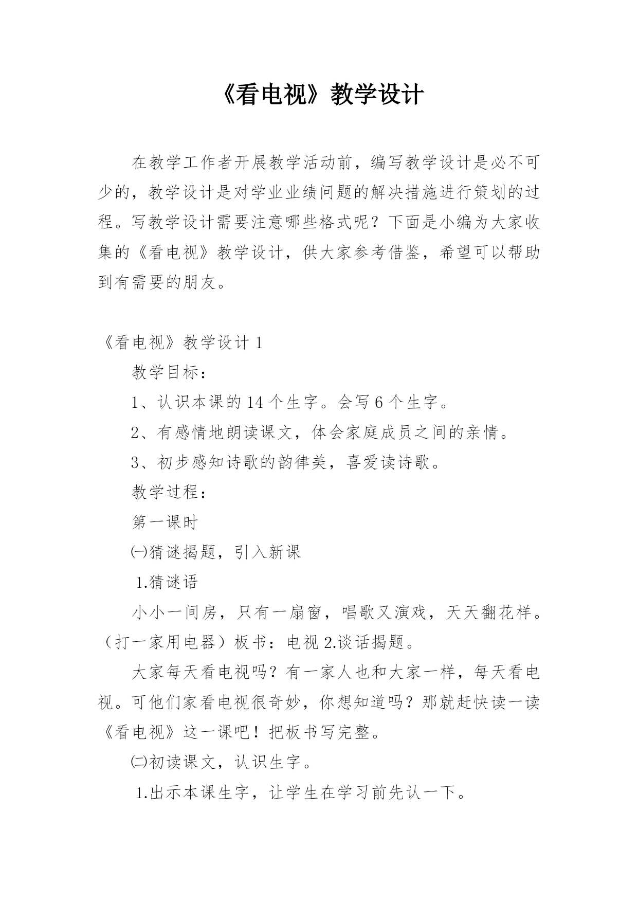 《看电视》教学设计在教学工作者开展教学活动前,编写教学设计是必不可少的,教学设计是对学业业绩问题的解决措施进行策划的过程。写教学设计需要注意哪些格式呢?下面是小编为大家收集的《看电视》教学设计,供大家参考借鉴,希望可以帮助到有需要的朋友。《看电视》教学设计1教学目标:1、认识本课的14个生字。会写6个生字。2、有感情地朗读课文,体会家庭成员之间的亲情。3、初步感知诗歌的韵律美,喜爱读诗歌。教学过程:第一课时㈠猜谜揭题,引入新课⒈猜谜语小小一间房,只有一扇窗,唱歌又演戏,天天翻花样。(打一家用电器)板书:电