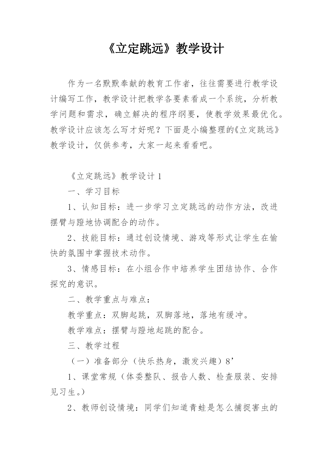 《立定跳远》教学设计作为一名默默奉献的教育工作者,往往需要进行教学设计编写工作,教学设计把教学各要素看成一个系统,分析教学问题和需求,确立解决的程序纲要,使教学效果最优化。教学设计应该怎么写才好呢?下面是小编整理的《立定跳远》教学设计,仅供参考,大家一起来看看吧。《立定跳远》教学设计1一、学习目标1、认知目标:进一步学习立定跳远的动作方法,改进摆臂与蹬地协调配合的动作。2、技能目标:通过创设情境、游戏等形式让学生在愉快的氛围中掌握技术动作。3、情感目标:在小组合作中培养学生团结协作、合作探究的意识。二、教