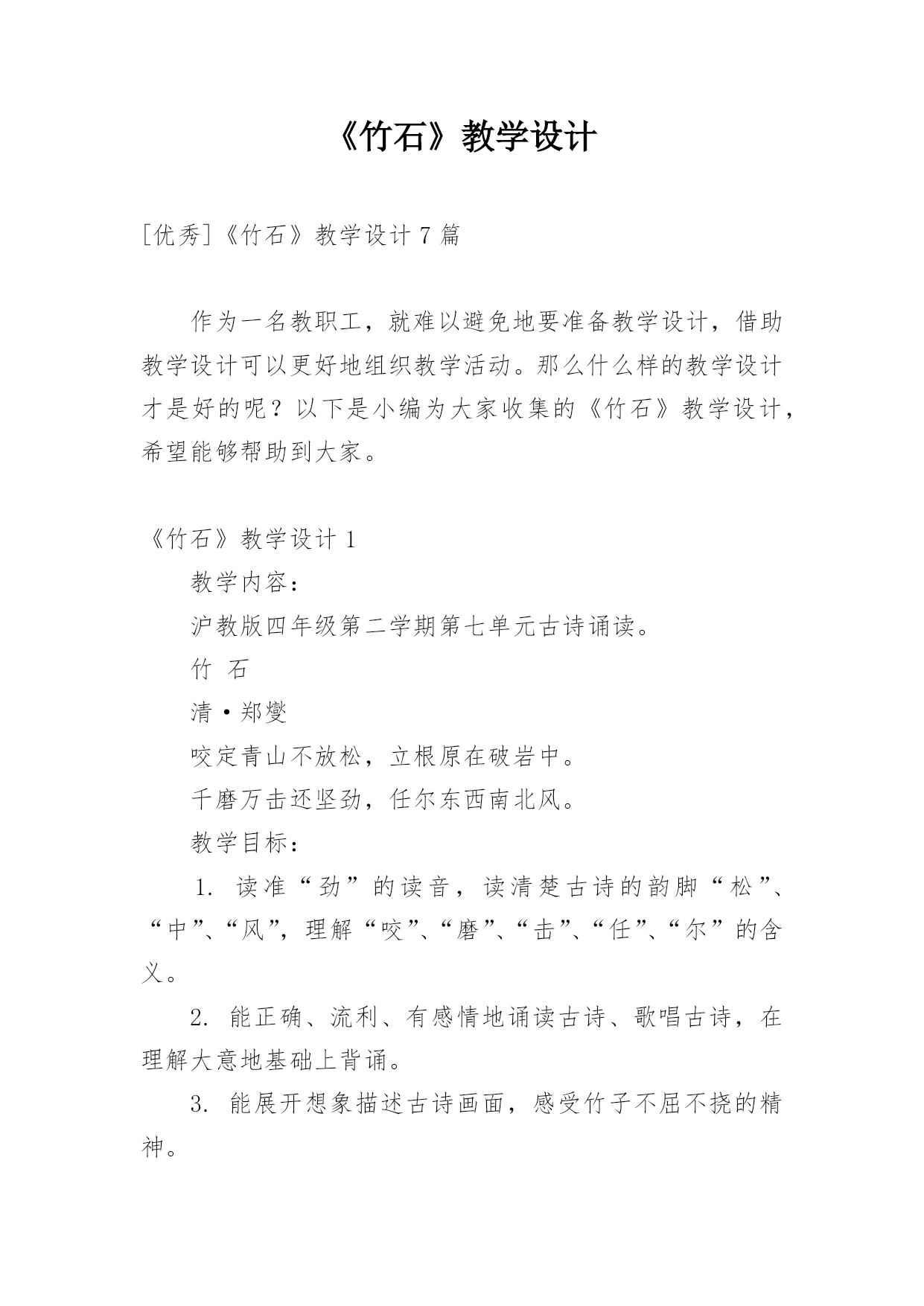 《竹石》教学设计[优秀]《竹石》教学设计7篇作为一名教职工,就难以避免地要准备教学设计,借助教学设计可以更好地组织教学活动。那么什么样的教学设计才是好的呢?以下是小编为大家收集的《竹石》教学设计,希望能够帮助到大家。《竹石》教学设计1教学内容:沪教版四年级第二学期第七单元古诗诵读。竹石清·郑燮咬定青山不放松,立根原在破岩中。千磨万击还坚劲,任尔东西南北风。教学目标:1.读准“劲”的读音,读清楚古诗的韵脚“松”、“中”、“风”,理解“咬”、“磨”、“击”、“任”、“尔”的含义。2.能正确、流利、有感情地诵读
