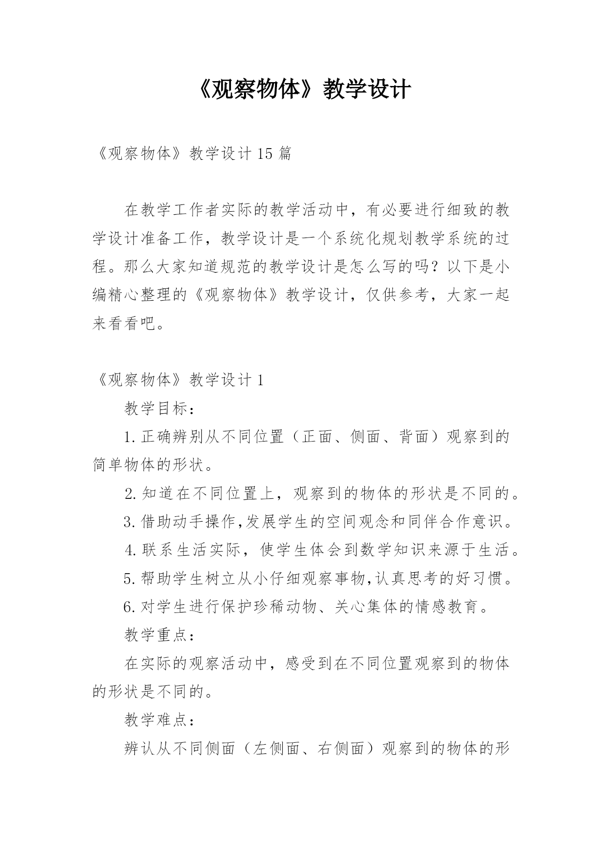 《观察物体》教学设计《观察物体》教学设计15篇在教学工作者实际的教学活动中,有必要进行细致的教学设计准备工作,教学设计是一个系统化规划教学系统的过程。那么大家知道规范的教学设计是怎么写的吗?以下是小编精心整理的《观察物体》教学设计,仅供参考,大家一起来看看吧。《观察物体》教学设计1教学目标:1.正确辨别从不同位置(正面、侧面、背面)观察到的简单物体的形状。2.知道在不同位置上,观察到的物体的形状是不同的。3.借助动手操作,发展学生的空间观念和同伴合作意识。4.联系生活实际,使学生体会到数学知识来源于生活。