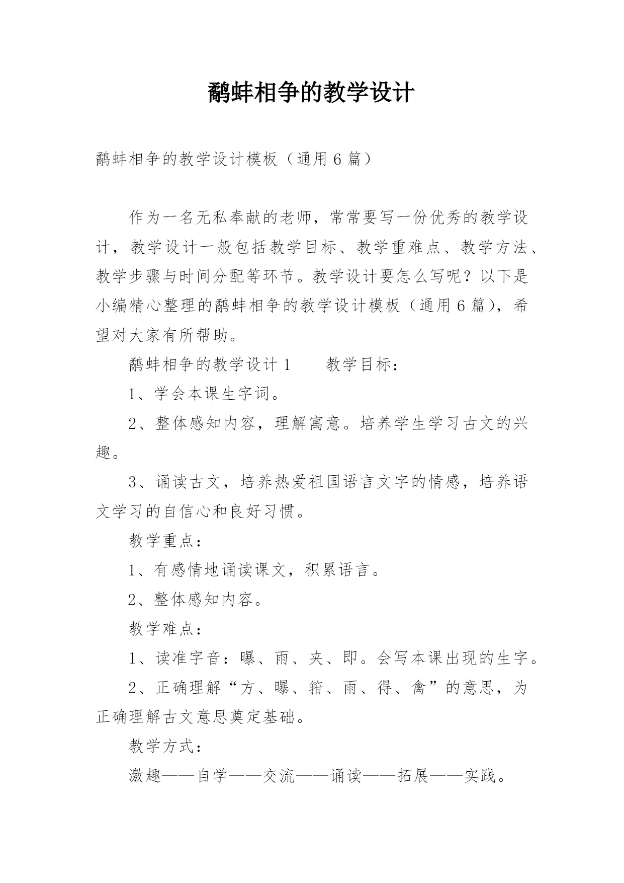 鹬蚌相争的教学设计鹬蚌相争的教学设计模板(通用6篇)作为一名无私奉献的老师,常常要写一份优秀的教学设计,教学设计一般包括教学目标、教学重难点、教学方法、教学步骤与时间分配等环节。教学设计要怎么写呢?以下是小编精心整理的鹬蚌相争的教学设计模板(通用6篇),希望对大家有所帮助。鹬蚌相争的教学设计1教学目标:1、学会本课生字词。2、整体感知内容,理解寓意。培养学生学习古文的兴趣。3、诵读古文,培养热爱祖国语言文字的情感,培养语文学习的自信心和良好习惯。教学重点:1、有感情地诵读课文,积累语言。2、整体感知内容。