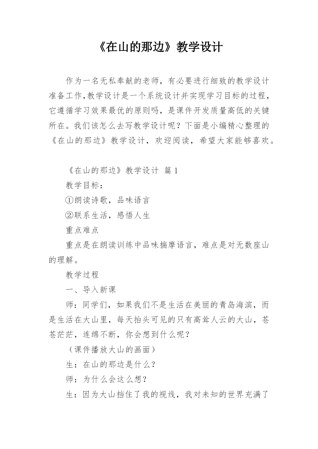 《在山的那边》教学设计作为一名无私奉献的老师,有必要进行细致的教学设计准备工作,教学设计是一个系统设计并实现学习目标的过程,它遵循学习效果最优的原则吗,是课件开发质量高低的关键所在。我们该怎么去写教学设计呢?下面是小编精心整理的《在山的那边》教学设计,欢迎阅读,希望大家能够喜欢。《在山的那边》教学设计篇1教学目标:①朗读诗歌,品味语言②联系生活,感悟人生重点难点重点是在朗读训练中品味揣摩语言,难点是对无数座山的理解。教学过程一、导入新课师:同学们,如果我们不是生活在美丽的青岛海滨,而是生活在大山里,每天抬