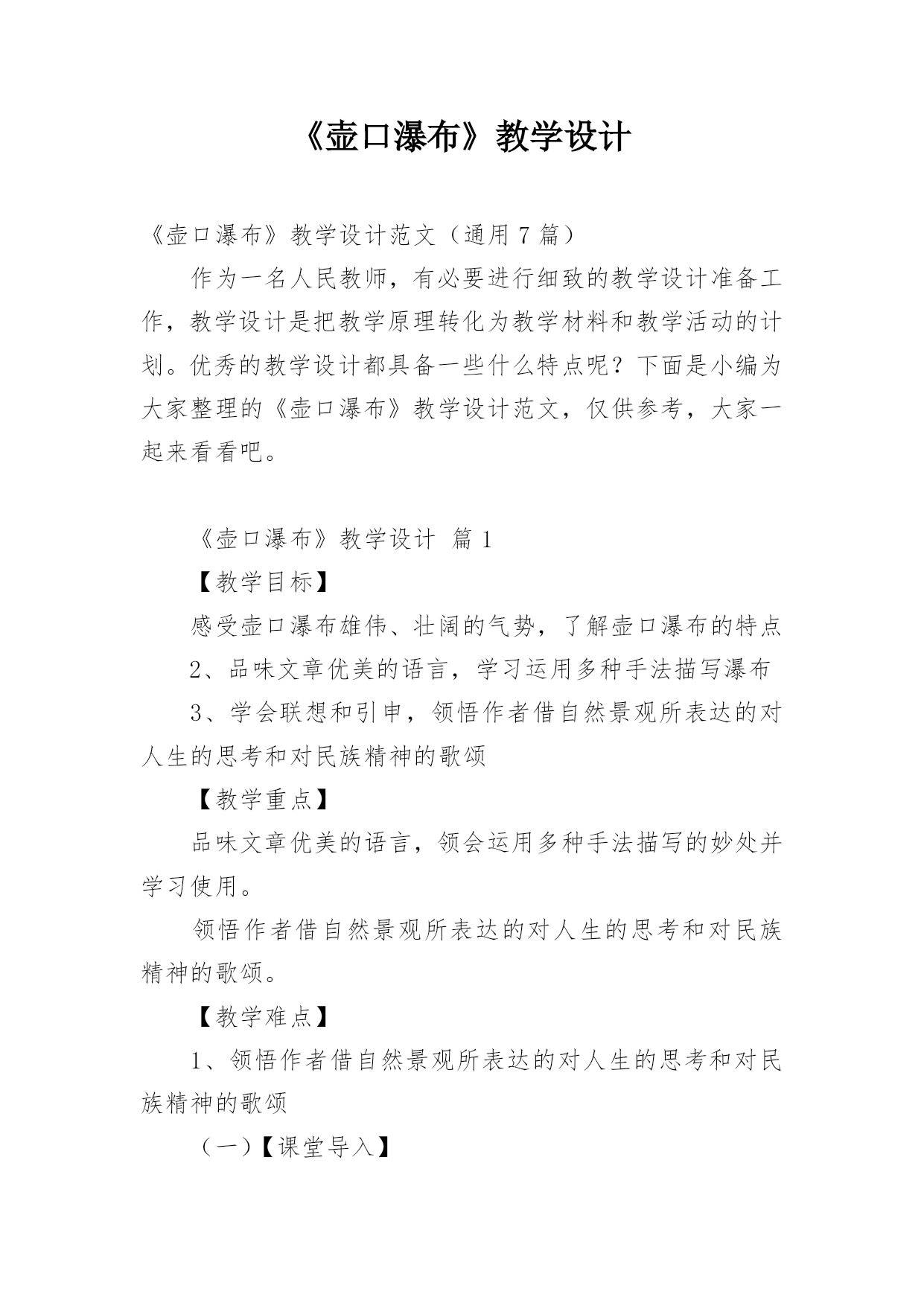《壶口瀑布》教学设计《壶口瀑布》教学设计范文(通用7篇)作为一名人民教师,有必要进行细致的教学设计准备工作,教学设计是把教学原理转化为教学材料和教学活动的计划。优秀的教学设计都具备一些什么特点呢?下面是小编为大家整理的《壶口瀑布》教学设计范文,仅供参考,大家一起来看看吧。《壶口瀑布》教学设计篇1【教学目标】感受壶口瀑布雄伟、壮阔的气势,了解壶口瀑布的特点2、品味文章优美的语言,学习运用多种手法描写瀑布3、学会联想和引申,领悟作者借自然景观所表达的对人生的思考和对民族精神的歌颂【教学重点】品味文章优美的语言