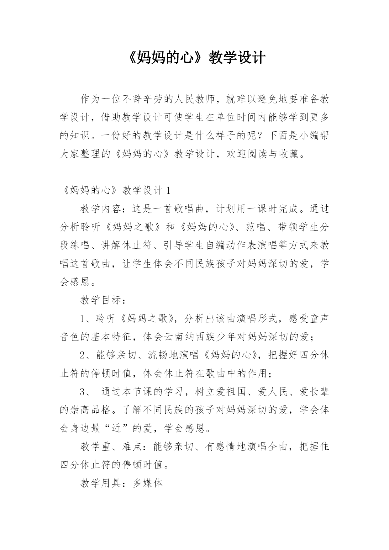 《妈妈的心》教学设计作为一位不辞辛劳的人民教师,就难以避免地要准备教学设计,借助教学设计可使学生在单位时间内能够学到更多的知识。一份好的教学设计是什么样子的呢?下面是小编帮大家整理的《妈妈的心》教学设计,欢迎阅读与收藏。《妈妈的心》教学设计1教学内容:这是一首歌唱曲,计划用一课时完成。通过分析聆听《妈妈之歌》和《妈妈的心》、范唱、带领学生分段练唱、讲解休止符、引导学生自编动作表演唱等方式来教唱这首歌曲,让学生体会不同民族孩子对妈妈深切的爱,学会感恩。教学目标:1、聆听《妈妈之歌》,分析出该曲演唱形式,感受