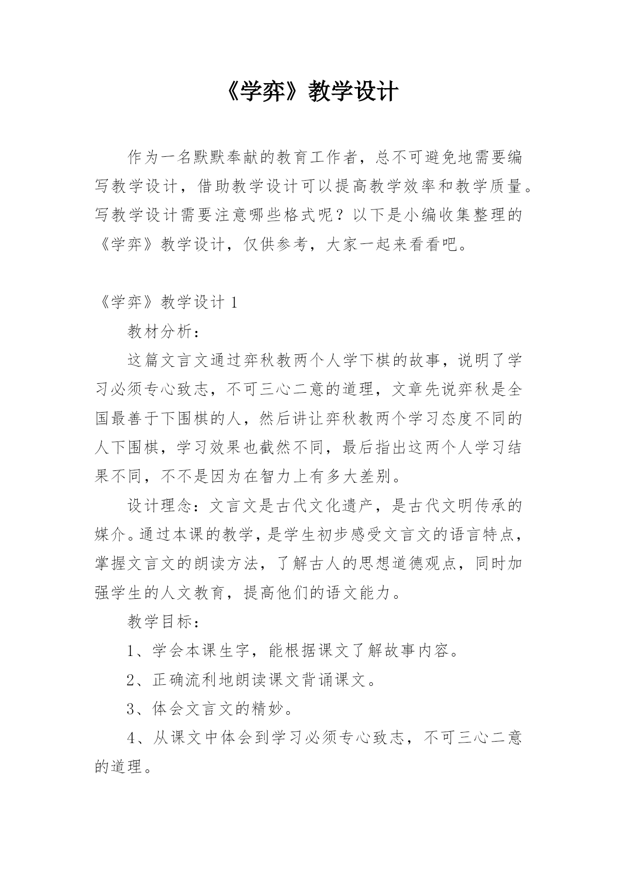 《学弈》教学设计作为一名默默奉献的教育工作者,总不可避免地需要编写教学设计,借助教学设计可以提高教学效率和教学质量。写教学设计需要注意哪些格式呢?以下是小编收集整理的《学弈》教学设计,仅供参考,大家一起来看看吧。《学弈》教学设计1教材分析:这篇文言文通过弈秋教两个人学下棋的故事,说明了学习必须专心致志,不可三心二意的道理,文章先说弈秋是全国最善于下围棋的人,然后讲让弈秋教两个学习态度不同的人下围棋,学习效果也截然不同,最后指出这两个人学习结果不同,不不是因为在智力上有多大差别。设计理念:文言文是古代文化遗