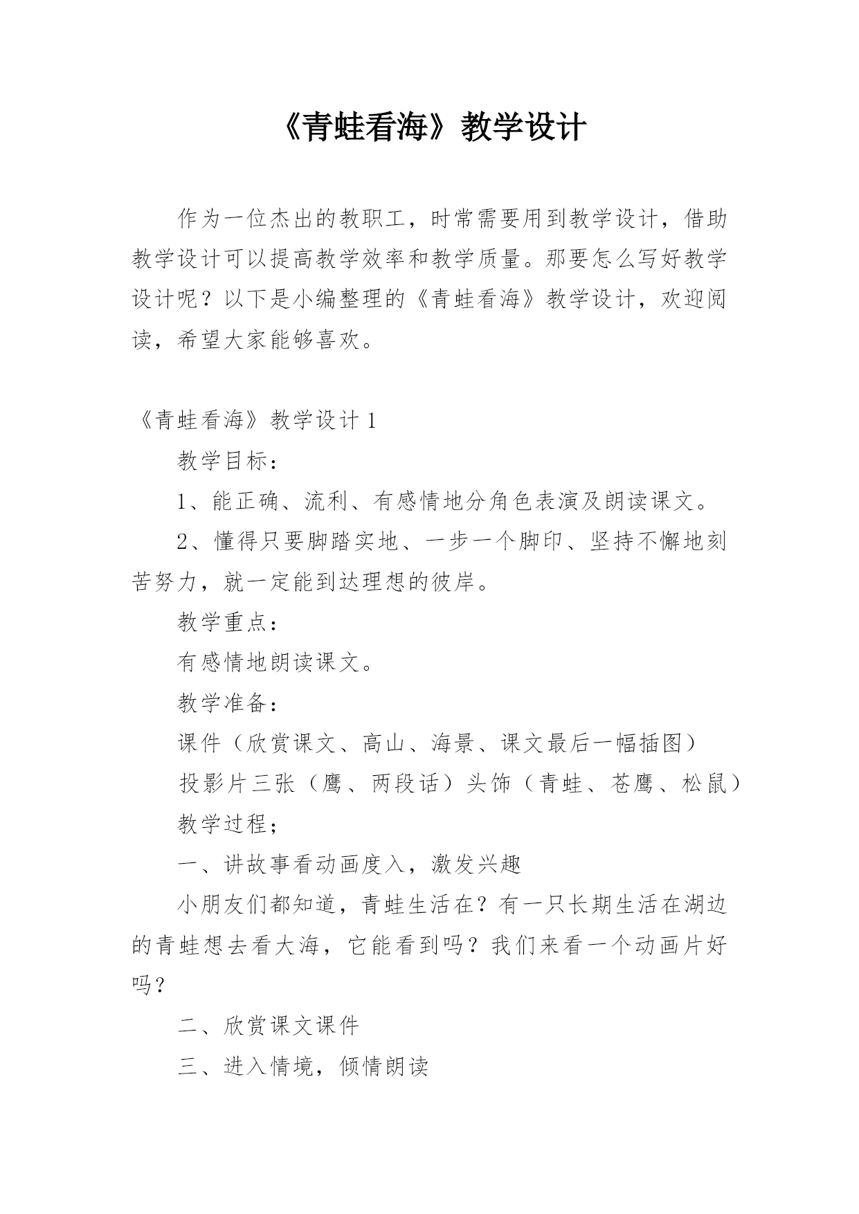 《青蛙看海》教学设计作为一位杰出的教职工,时常需要用到教学设计,借助教学设计可以提高教学效率和教学质量。那要怎么写好教学设计呢?以下是小编整理的《青蛙看海》教学设计,欢迎阅读,希望大家能够喜欢。《青蛙看海》教学设计1教学目标:1、能正确、流利、有感情地分角色表演及朗读课文。2、懂得只要脚踏实地、一步一个脚印、坚持不懈地刻苦努力,就一定能到达理想的彼岸。教学重点:有感情地朗读课文。教学准备:课件(欣赏课文、高山、海景、课文最后一幅插图)投影片三张(鹰、两段话)头饰(青蛙、苍鹰、松鼠)教学过程;一、讲故事看动