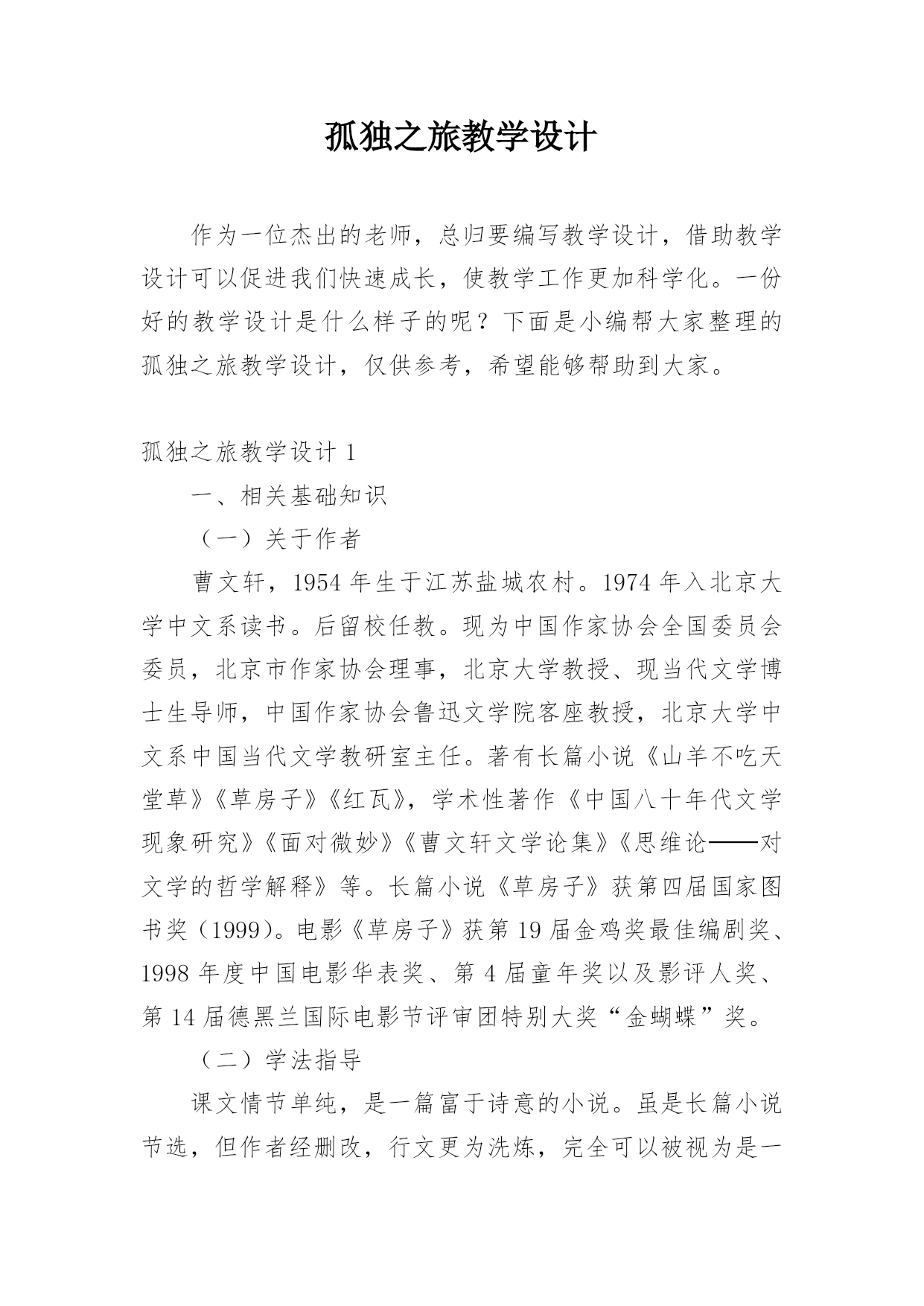 孤独之旅教学设计作为一位杰出的老师,总归要编写教学设计,借助教学设计可以促进我们快速成长,使教学工作更加科学化。一份好的教学设计是什么样子的呢?下面是小编帮大家整理的孤独之旅教学设计,仅供参考,希望能够帮助到大家。孤独之旅教学设计1一、相关基础知识(一)关于作者曹文轩,1954年生于江苏盐城农村。1974年入北京大学中文系读书。后留校任教。现为中国作家协会全国委员会委员,北京市作家协会理事,北京大学教授、现当代文学博士生导师,中国作家协会鲁迅文学院客座教授,北京大学中文系中国当代文学教研室主任。著有长篇小