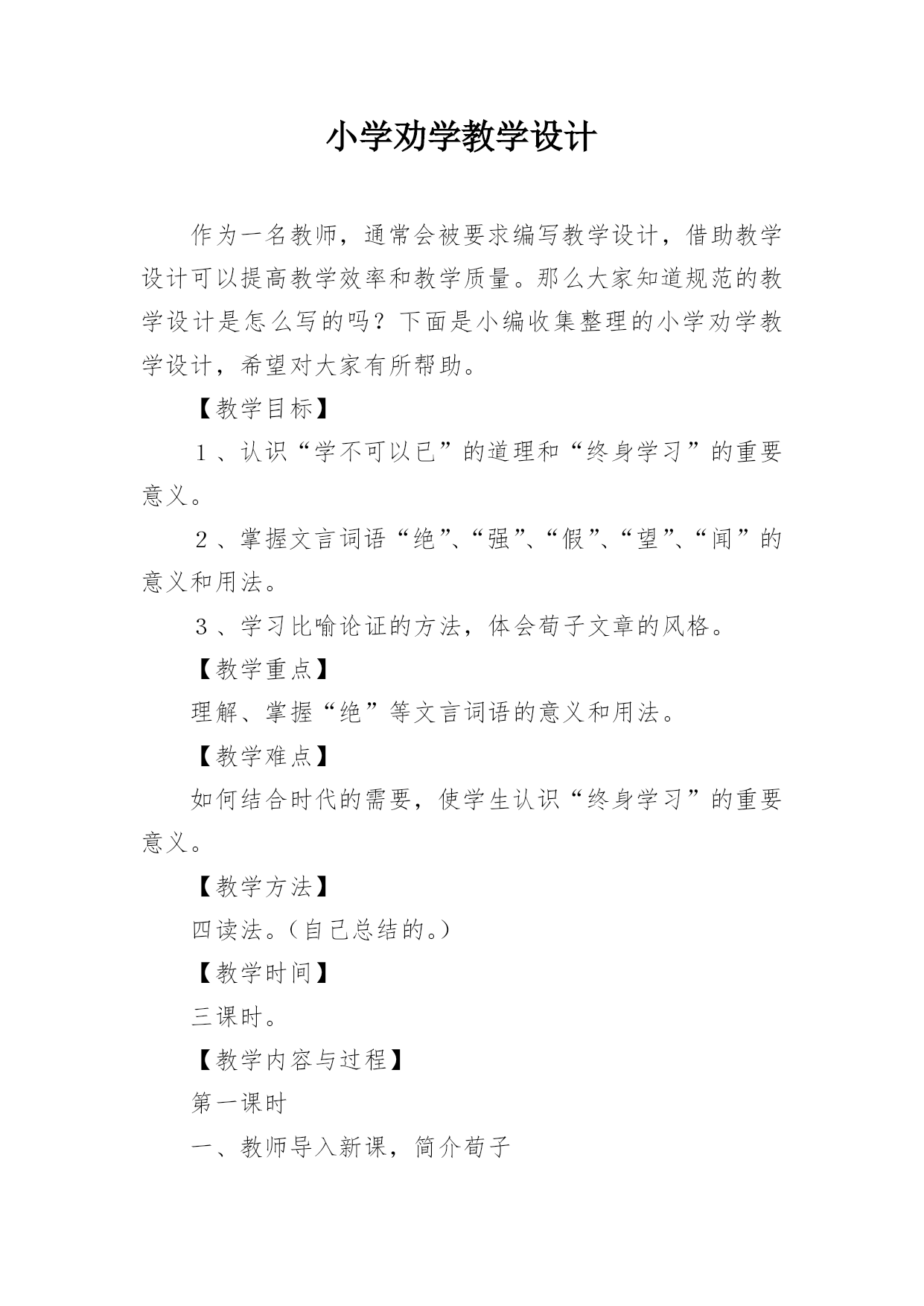 小学劝学教学设计作为一名教师,通常会被要求编写教学设计,借助教学设计可以提高教学效率和教学质量。那么大家知道规范的教学设计是怎么写的吗?下面是小编收集整理的小学劝学教学设计,希望对大家有所帮助。【教学目标】1、认识“学不可以已”的道理和“终身学习”的重要意义。2、掌握文言词语“绝”、“强”、“假”、“望”、“闻”的意义和用法。3、学习比喻论证的方法,体会荀子文章的风格。【教学重点】理解、掌握“绝”等文言词语的意义和用法。【教学难点】如何结合时代的需要,使学生认识“终身学习”的重要意义。【教学方法】四读法。