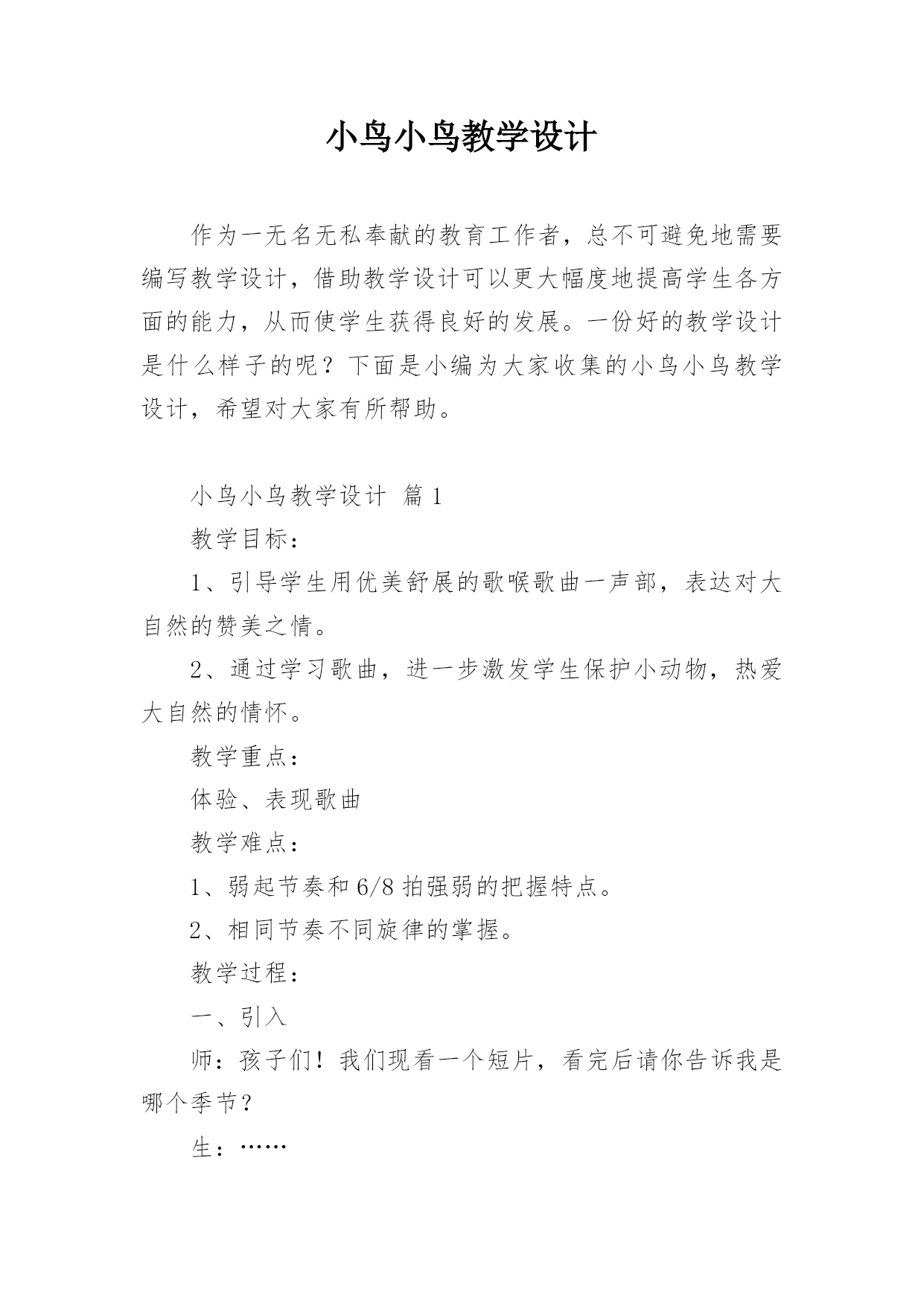小鸟小鸟教学设计作为一无名无私奉献的教育工作者,总不可避免地需要编写教学设计,借助教学设计可以更大幅度地提高学生各方面的能力,从而使学生获得良好的发展。一份好的教学设计是什么样子的呢?下面是小编为大家收集的小鸟小鸟教学设计,希望对大家有所帮助。小鸟小鸟教学设计篇1教学目标:1、引导学生用优美舒展的歌喉歌曲一声部,表达对大自然的赞美之情。2、通过学习歌曲,进一步激发学生保护小动物,热爱大自然的情怀。教学重点:体验、表现歌曲教学难点:1、弱起节奏和6/8拍强弱的把握特点。2、相同节奏不同旋律的掌握。教学过程: