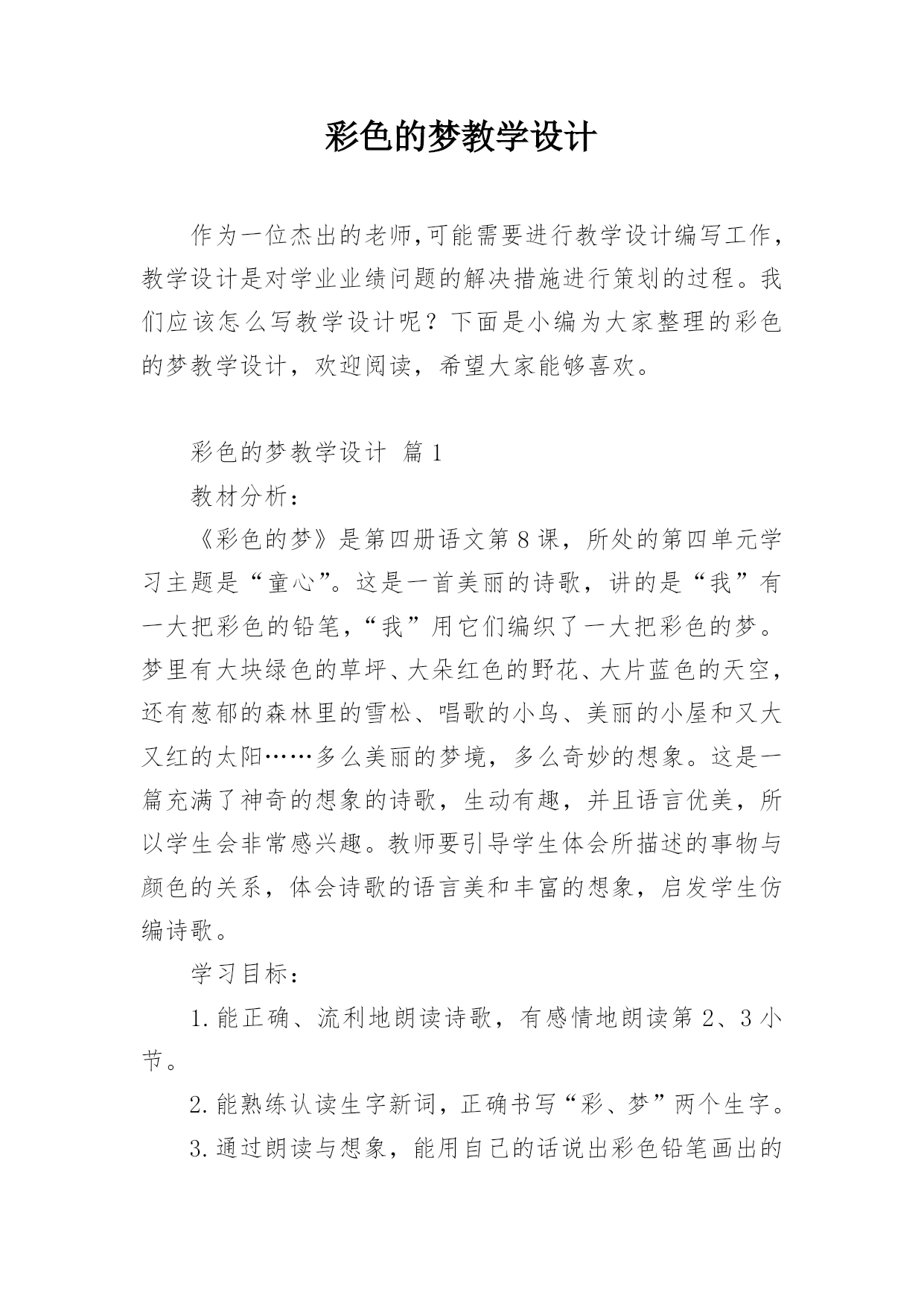 彩色的梦教学设计作为一位杰出的老师,可能需要进行教学设计编写工作,教学设计是对学业业绩问题的解决措施进行策划的过程。我们应该怎么写教学设计呢?下面是小编为大家整理的彩色的梦教学设计,欢迎阅读,希望大家能够喜欢。彩色的梦教学设计篇1教材分析:《彩色的梦》是第四册语文第8课,所处的第四单元学习主题是“童心”。这是一首美丽的诗歌,讲的是“我”有一大把彩色的铅笔,“我”用它们编织了一大把彩色的梦。梦里有大块绿色的草坪、大朵红色的野花、大片蓝色的天空,还有葱郁的森林里的雪松、唱歌的小鸟、美丽的小屋和又大又红的太阳…