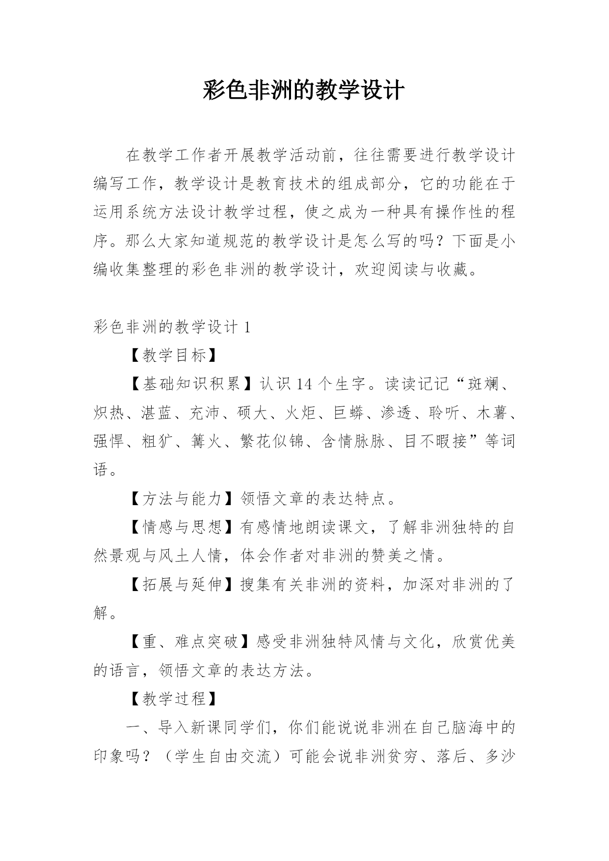 彩色非洲的教学设计在教学工作者开展教学活动前,往往需要进行教学设计编写工作,教学设计是教育技术的组成部分,它的功能在于运用系统方法设计教学过程,使之成为一种具有操作性的程序。那么大家知道规范的教学设计是怎么写的吗?下面是小编收集整理的彩色非洲的教学设计,欢迎阅读与收藏。彩色非洲的教学设计1【教学目标】【基础知识积累】认识14个生字。读读记记“斑斓、炽热、湛蓝、充沛、硕大、火炬、巨蟒、渗透、聆听、木薯、强悍、粗犷、篝火、繁花似锦、含情脉脉、目不暇接”等词语。【方法与能力】领悟文章的表达特点。【情感与思想】有