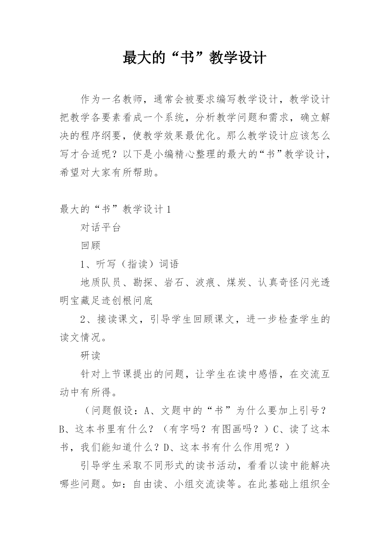 最大的“书”教学设计作为一名教师,通常会被要求编写教学设计,教学设计把教学各要素看成一个系统,分析教学问题和需求,确立解决的程序纲要,使教学效果最优化。那么教学设计应该怎么写才合适呢?以下是小编精心整理的最大的“书”教学设计,希望对大家有所帮助。最大的“书”教学设计1对话平台回顾1、听写(指读)词语地质队员、勘探、岩石、波痕、煤炭、认真奇怪闪光透明宝藏足迹创根问底2、接读课文,引导学生回顾课文,进一步检查学生的读文情况。研读针对上节课提出的问题,让学生在读中感悟,在交流互动中有所得。(问题假设:A、文题中