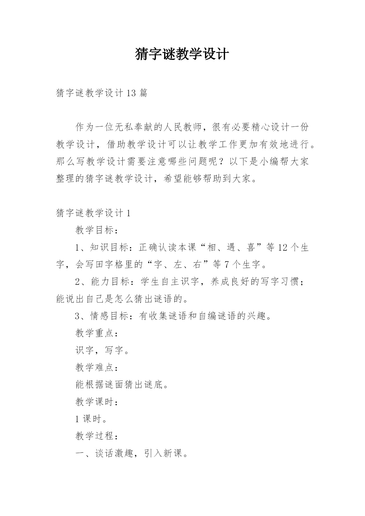 猜字谜教学设计猜字谜教学设计13篇作为一位无私奉献的人民教师,很有必要精心设计一份教学设计,借助教学设计可以让教学工作更加有效地进行。那么写教学设计需要注意哪些问题呢?以下是小编帮大家整理的猜字谜教学设计,希望能够帮助到大家。猜字谜教学设计1教学目标:1、知识目标:正确认读本课“相、遇、喜”等12个生字,会写田字格里的“字、左、右”等7个生字。2、能力目标:学生自主识字,养成良好的写字习惯;能说出自己是怎么猜出谜语的。3、情感目标:有收集谜语和自编谜语的兴趣。教学重点:识字,写字。教学难点:能根据谜面猜出