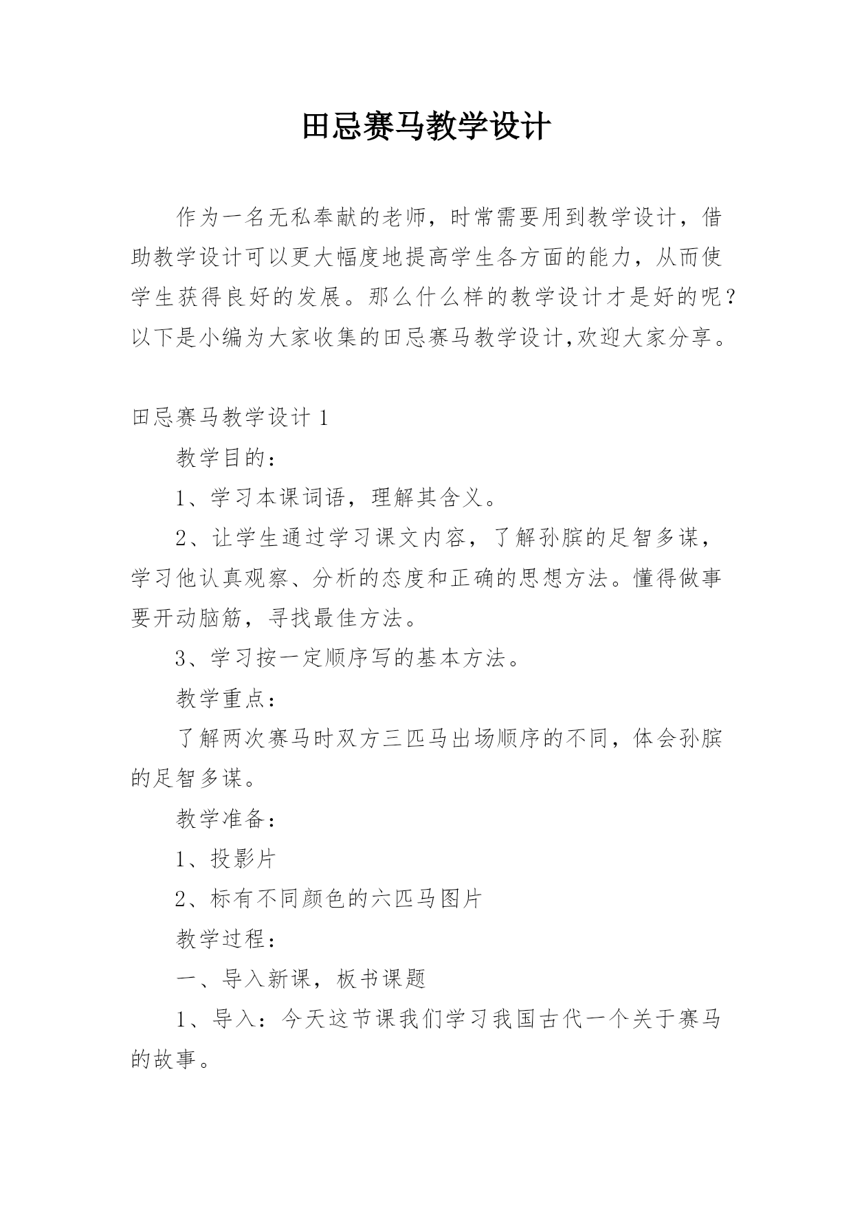 田忌赛马教学设计作为一名无私奉献的老师,时常需要用到教学设计,借助教学设计可以更大幅度地提高学生各方面的能力,从而使学生获得良好的发展。那么什么样的教学设计才是好的呢?以下是小编为大家收集的田忌赛马教学设计,欢迎大家分享。田忌赛马教学设计1教学目的:1、学习本课词语,理解其含义。2、让学生通过学习课文内容,了解孙膑的足智多谋,学习他认真观察、分析的态度和正确的思想方法。懂得做事要开动脑筋,寻找最佳方法。3、学习按一定顺序写的基本方法。教学重点:了解两次赛马时双方三匹马出场顺序的不同,体会孙膑的足智多谋。教