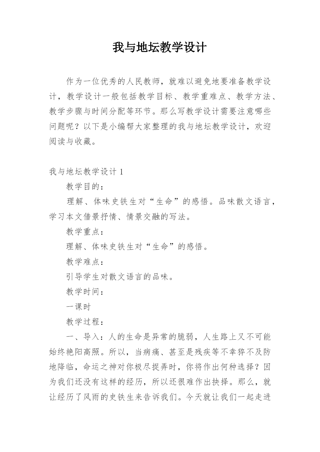 我与地坛教学设计作为一位优秀的人民教师,就难以避免地要准备教学设计,教学设计一般包括教学目标、教学重难点、教学方法、教学步骤与时间分配等环节。那么写教学设计需要注意哪些问题呢?以下是小编帮大家整理的我与地坛教学设计,欢迎阅读与收藏。我与地坛教学设计1教学目的:理解、体味史铁生对“生命”的感悟。品味散文语言,学习本文借景抒情、情景交融的写法。教学重点:理解、体味史铁生对“生命”的感悟。教学难点:引导学生对散文语言的品味。教学时间:一课时教学过程:一、导入:人的生命是异常的脆弱,人生路上又不可能始终艳阳高照。