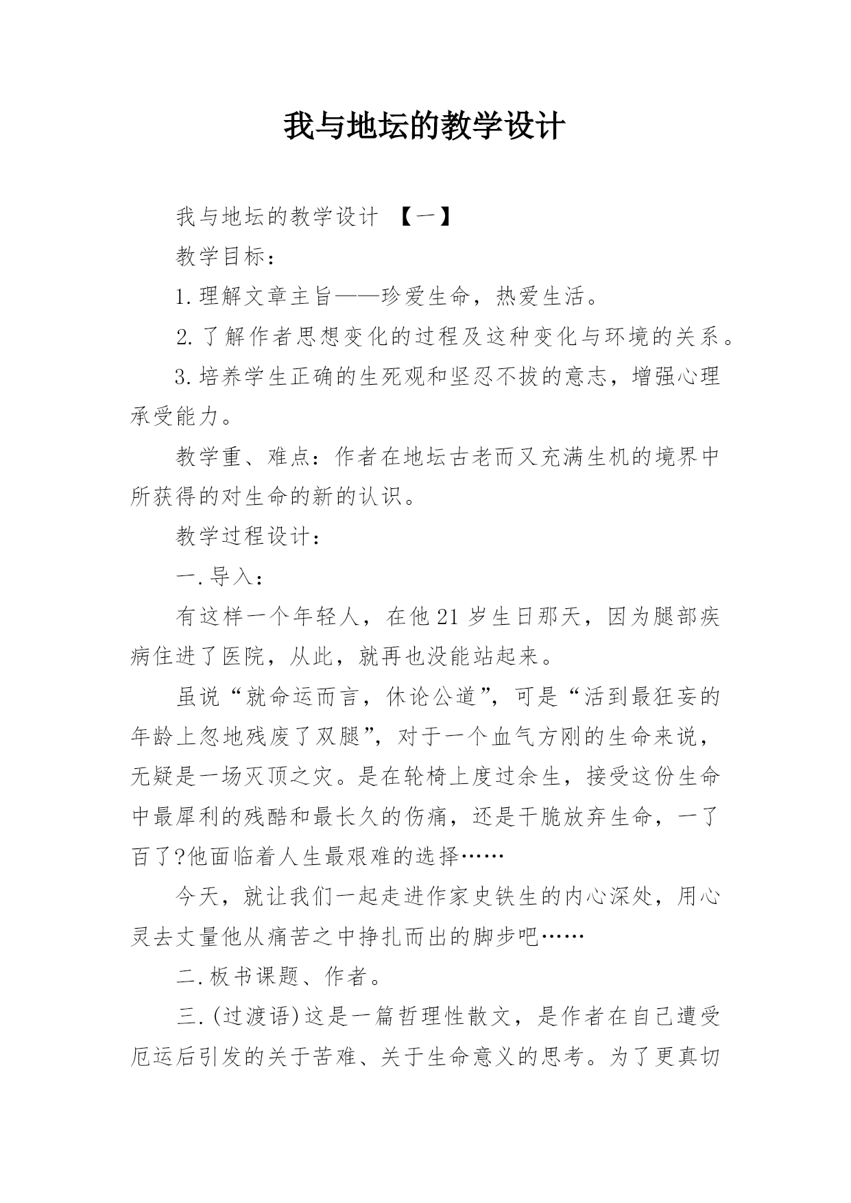 我与地坛的教学设计我与地坛的教学设计【一】教学目标:1.理解文章主旨——珍爱生命,热爱生活。2.了解作者思想变化的过程及这种变化与环境的关系。3.培养学生正确的生死观和坚忍不拔的意志,增强心理承受能力。教学重、难点:作者在地坛古老而又充满生机的境界中所获得的对生命的新的认识。教学过程设计:一.导入:有这样一个年轻人,在他21岁生日那天,因为腿部疾病住进了医院,从此,就再也没能站起来。虽说“就命运而言,休论公道”,可是“活到最狂妄的年龄上忽地残废了双腿”,对于一个血气方刚的生命来说,无疑是一场灭顶之灾。是在