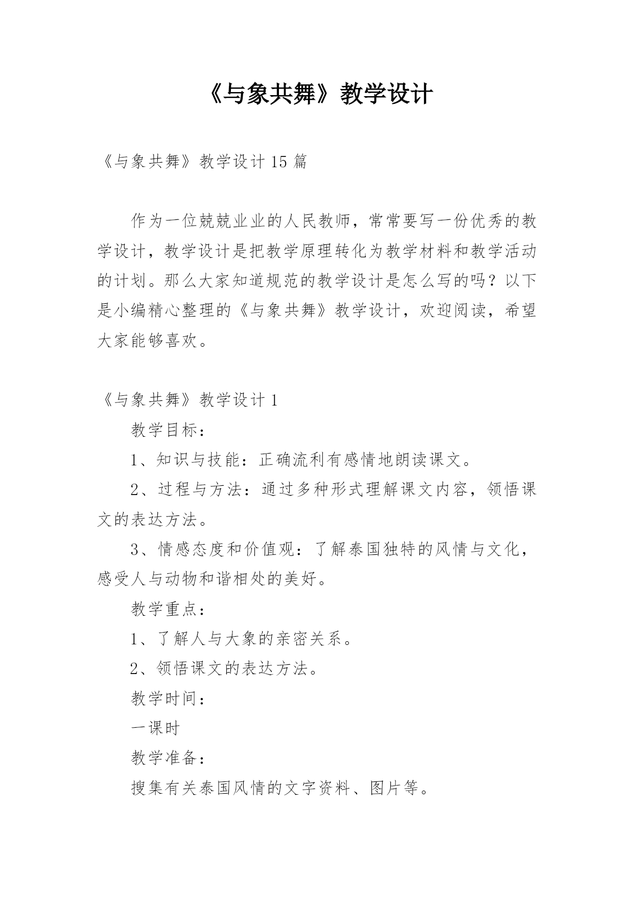 《与象共舞》教学设计《与象共舞》教学设计15篇作为一位兢兢业业的人民教师,常常要写一份优秀的教学设计,教学设计是把教学原理转化为教学材料和教学活动的计划。那么大家知道规范的教学设计是怎么写的吗?以下是小编精心整理的《与象共舞》教学设计,欢迎阅读,希望大家能够喜欢。《与象共舞》教学设计1教学目标:1、知识与技能:正确流利有感情地朗读课文。2、过程与方法:通过多种形式理解课文内容,领悟课文的表达方法。3、情感态度和价值观:了解泰国独特的风情与文化,感受人与动物和谐相处的美好。教学重点:1、了解人与大象的亲密关
