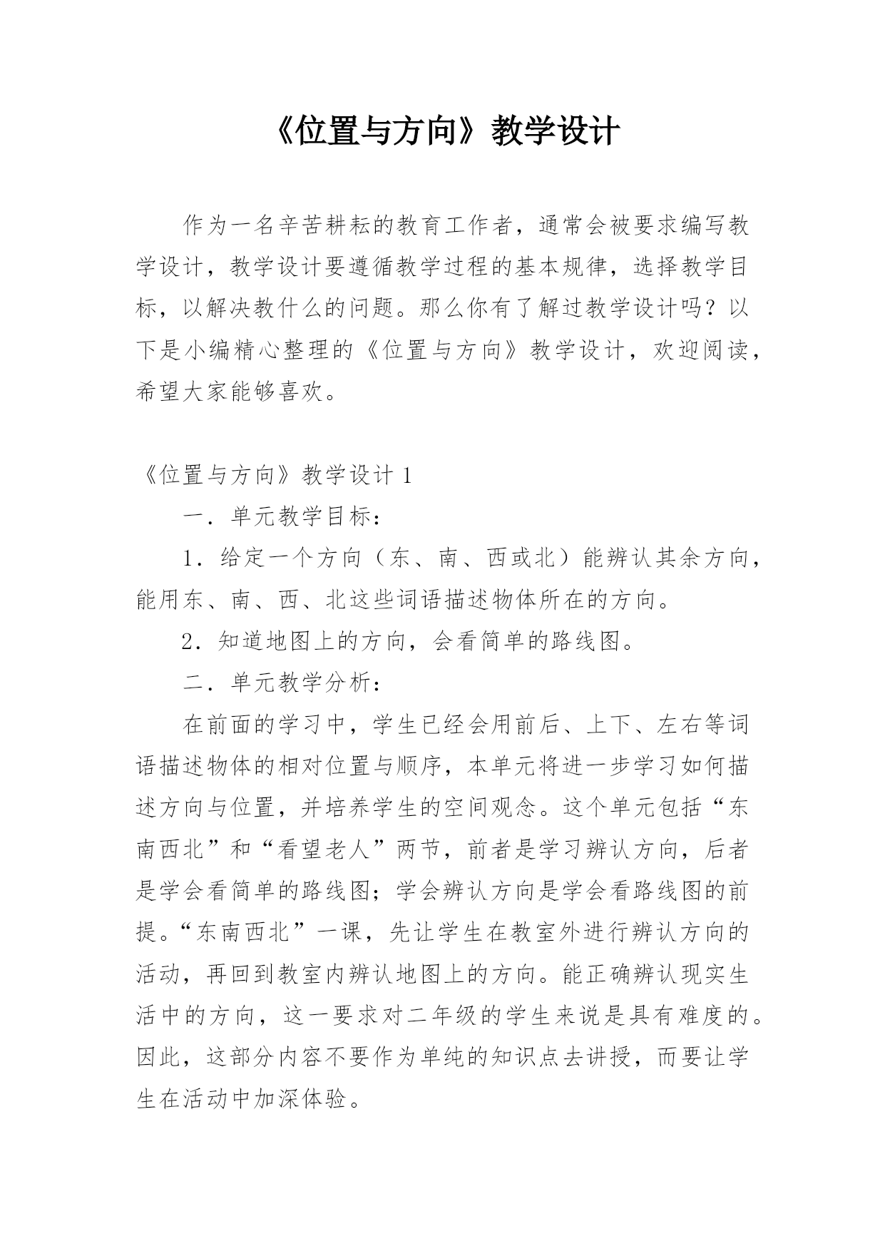 《位置与方向》教学设计作为一名辛苦耕耘的教育工作者,通常会被要求编写教学设计,教学设计要遵循教学过程的基本规律,选择教学目标,以解决教什么的问题。那么你有了解过教学设计吗?以下是小编精心整理的《位置与方向》教学设计,欢迎阅读,希望大家能够喜欢。《位置与方向》教学设计1一.单元教学目标:1.给定一个方向(东、南、西或北)能辨认其余方向,能用东、南、西、北这些词语描述物体所在的方向。2.知道地图上的方向,会看简单的路线图。二.单元教学分析:在前面的学习中,学生已经会用前后、上下、左右等词语描述物体的相对位置与