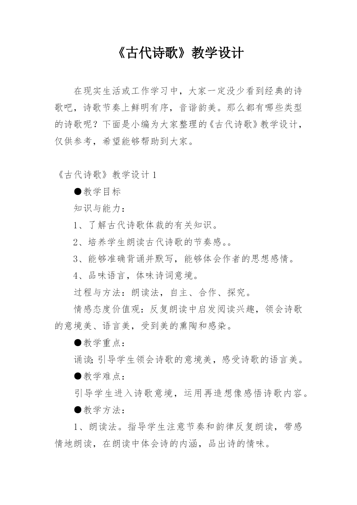 《古代诗歌》教学设计在现实生活或工作学习中,大家一定没少看到经典的诗歌吧,诗歌节奏上鲜明有序,音谐韵美。那么都有哪些类型的诗歌呢?下面是小编为大家整理的《古代诗歌》教学设计,仅供参考,希望能够帮助到大家。《古代诗歌》教学设计1●教学目标知识与能力:1、了解古代诗歌体裁的有关知识。2、培养学生朗读古代诗歌的节奏感。。3、能够准确背诵并默写,能够体会作者的思想感情。4、品味语言,体味诗词意境。过程与方法:朗读法,自主、合作、探究。情感态度价值观:反复朗读中启发阅读兴趣,领会诗歌的意境美、语言美,受到美的熏陶和