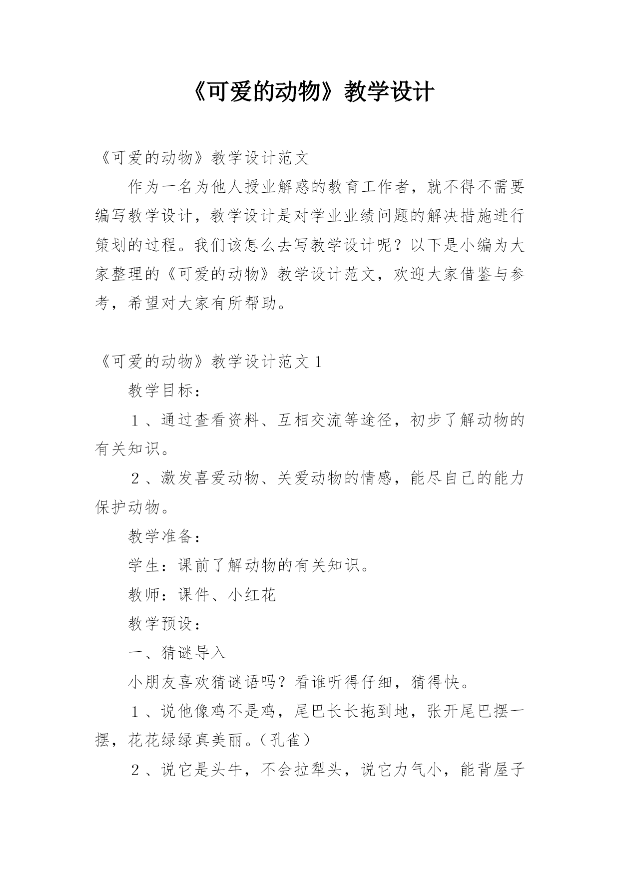《可爱的动物》教学设计《可爱的动物》教学设计范文作为一名为他人授业解惑的教育工作者,就不得不需要编写教学设计,教学设计是对学业业绩问题的解决措施进行策划的过程。我们该怎么去写教学设计呢?以下是小编为大家整理的《可爱的动物》教学设计范文,欢迎大家借鉴与参考,希望对大家有所帮助。《可爱的动物》教学设计范文1教学目标:1、通过查看资料、互相交流等途径,初步了解动物的有关知识。2、激发喜爱动物、关爱动物的情感,能尽自己的能力保护动物。教学准备:学生:课前了解动物的有关知识。教师:课件、小红花教学预设:一、猜谜导入