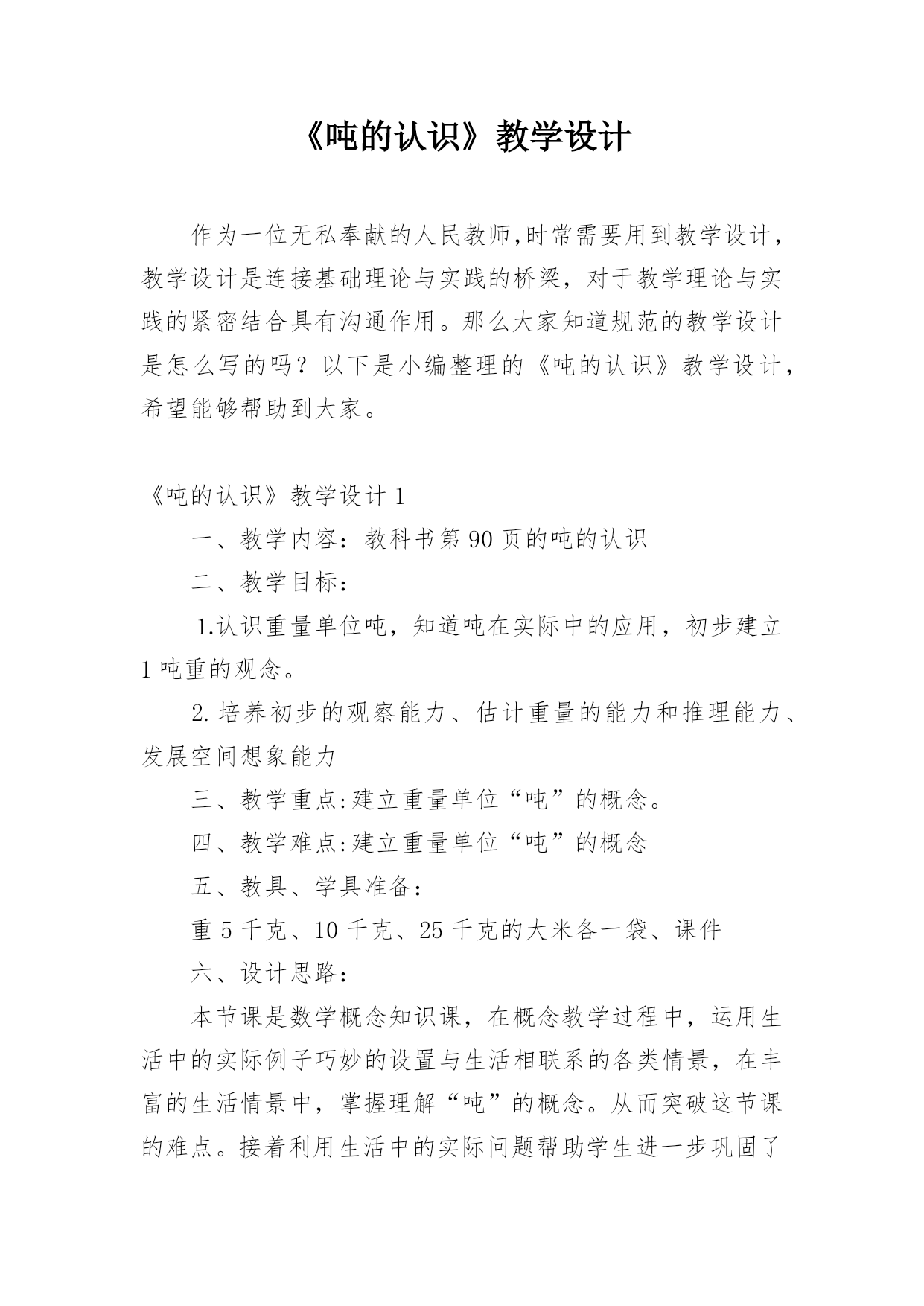 《吨的认识》教学设计作为一位无私奉献的人民教师,时常需要用到教学设计,教学设计是连接基础理论与实践的桥梁,对于教学理论与实践的紧密结合具有沟通作用。那么大家知道规范的教学设计是怎么写的吗?以下是小编整理的《吨的认识》教学设计,希望能够帮助到大家。《吨的认识》教学设计1一、教学内容:教科书的吨的认识二、教学目标:⒈认识重量单位吨,知道吨在实际中的应用,初步建立1吨重的观念。2.培养初步的观察能力、估计重量的能力和推理能力、发展空间想象能力三、教学重点:建立重量单位“吨”的概念。四、教学难点:建立重量单位“吨