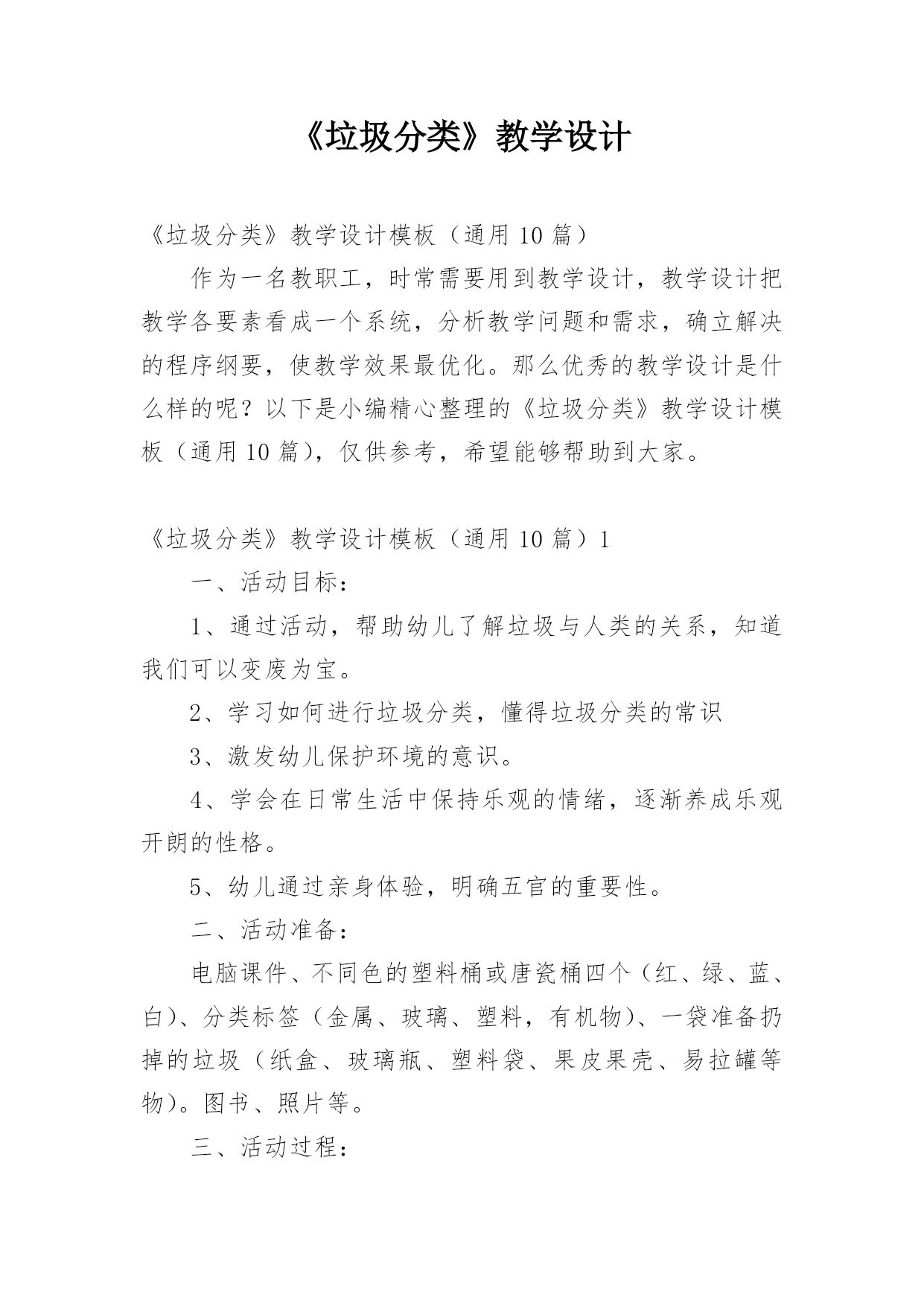 《垃圾分类》教学设计《垃圾分类》教学设计模板(通用10篇)作为一名教职工,时常需要用到教学设计,教学设计把教学各要素看成一个系统,分析教学问题和需求,确立解决的程序纲要,使教学效果最优化。那么优秀的教学设计是什么样的呢?以下是小编精心整理的《垃圾分类》教学设计模板(通用10篇),仅供参考,希望能够帮助到大家。《垃圾分类》教学设计模板(通用10篇)1一、活动目标:1、通过活动,帮助幼儿了解垃圾与人类的关系,知道我们可以变废为宝。2、学习如何进行垃圾分类,懂得垃圾分类的常识3、激发幼儿保护环境的意识。4、学会