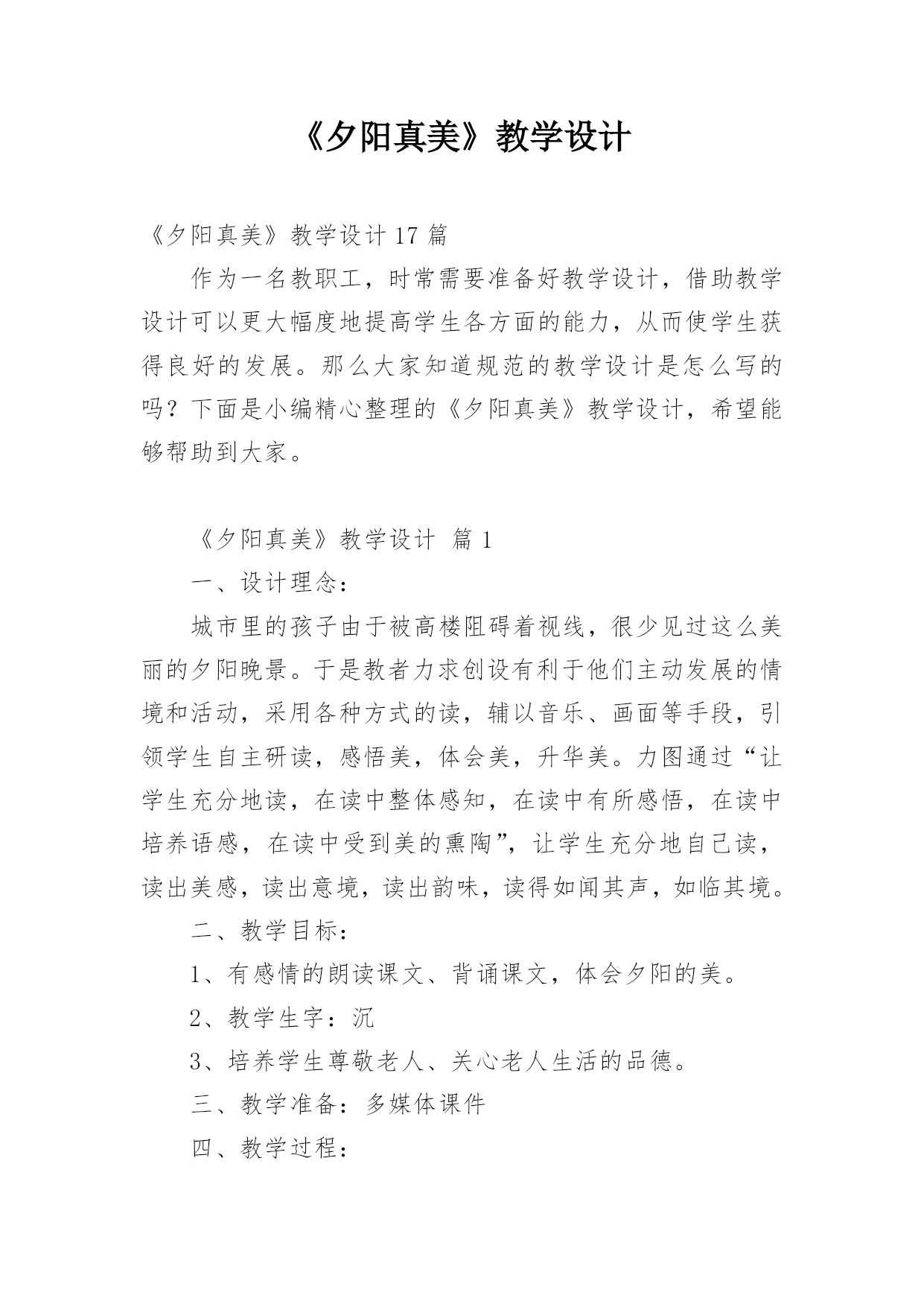 《夕阳真美》教学设计《夕阳真美》教学设计17篇作为一名教职工,时常需要准备好教学设计,借助教学设计可以更大幅度地提高学生各方面的能力,从而使学生获得良好的发展。那么大家知道规范的教学设计是怎么写的吗?下面是小编精心整理的《夕阳真美》教学设计,希望能够帮助到大家。《夕阳真美》教学设计篇1一、设计理念:城市里的孩子由于被高楼阻碍着视线,很少见过这么美丽的夕阳晚景。于是教者力求创设有利于他们主动发展的情境和活动,采用各种方式的读,辅以音乐、画面等手段,引领学生自主研读,感悟美,体会美,升华美。力图通过“让学生充