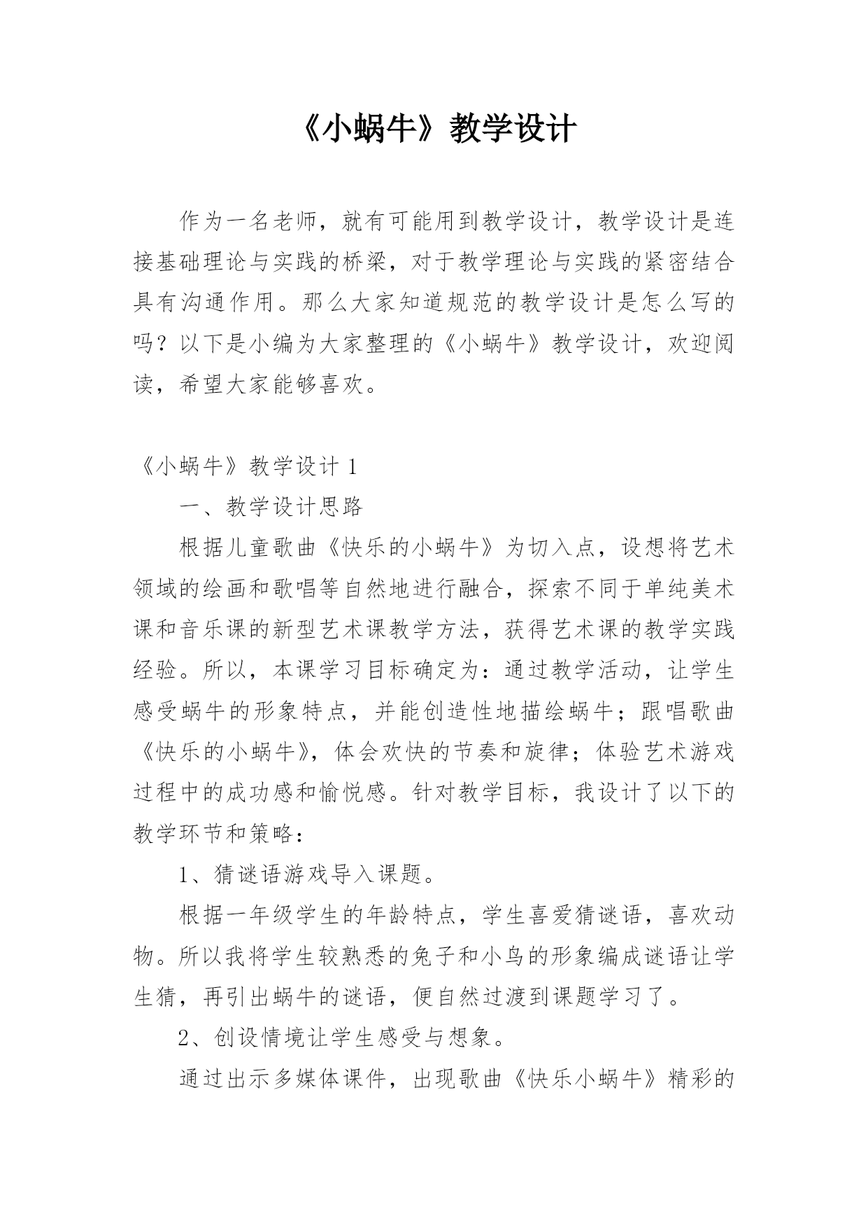 《小蜗牛》教学设计作为一名老师,就有可能用到教学设计,教学设计是连接基础理论与实践的桥梁,对于教学理论与实践的紧密结合具有沟通作用。那么大家知道规范的教学设计是怎么写的吗?以下是小编为大家整理的《小蜗牛》教学设计,欢迎阅读,希望大家能够喜欢。《小蜗牛》教学设计1一、教学设计思路根据儿童歌曲《快乐的小蜗牛》为切入点,设想将艺术领域的绘画和歌唱等自然地进行融合,探索不同于单纯美术课和音乐课的新型艺术课教学方法,获得艺术课的教学实践经验。所以,本课学习目标确定为:通过教学活动,让学生感受蜗牛的形象特点,并能创造
