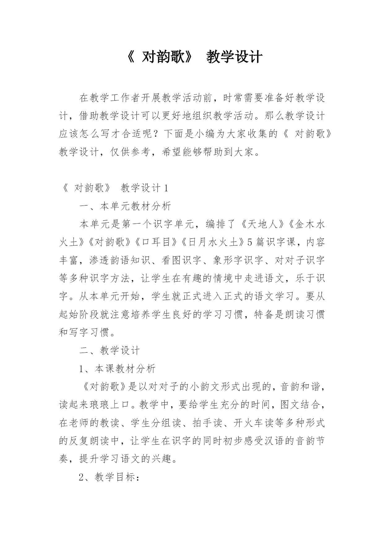 《对韵歌》教学设计在教学工作者开展教学活动前,时常需要准备好教学设计,借助教学设计可以更好地组织教学活动。那么教学设计应该怎么写才合适呢?下面是小编为大家收集的《对韵歌》教学设计,仅供参考,希望能够帮助到大家。《对韵歌》教学设计1一、本单元教材分析本单元是第一个识字单元,编排了《天地人》《金木水火土》《对韵歌》《口耳目》《日月水火土》5篇识字课,内容丰富,渗透韵语知识、看图识字、象形字识字、对对子识字等多种识字方法,让学生在有趣的情境中走进语文,乐于识字。从本单元开始,学生就正式进入正式的语文学习。要从起
