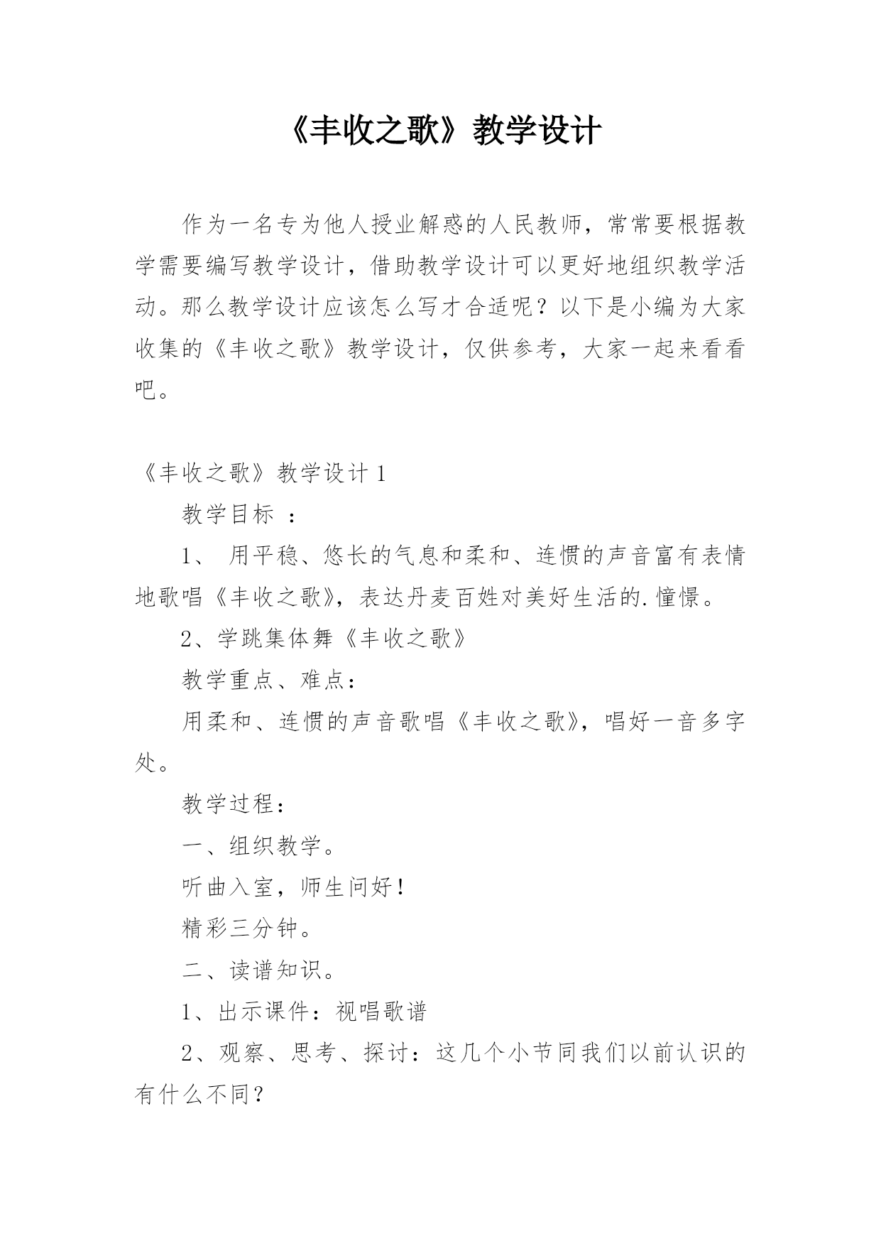 《丰收之歌》教学设计作为一名专为他人授业解惑的人民教师,常常要根据教学需要编写教学设计,借助教学设计可以更好地组织教学活动。那么教学设计应该怎么写才合适呢?以下是小编为大家收集的《丰收之歌》教学设计,仅供参考,大家一起来看看吧。《丰收之歌》教学设计1教学目标:1、用平稳、悠长的气息和柔和、连惯的声音富有表情地歌唱《丰收之歌》,表达丹麦百姓对美好生活的.憧憬。2、学跳集体舞《丰收之歌》教学重点、难点:用柔和、连惯的声音歌唱《丰收之歌》,唱好一音多字处。教学过程:一、组织教学。听曲入室,师生问好!精彩三分钟。