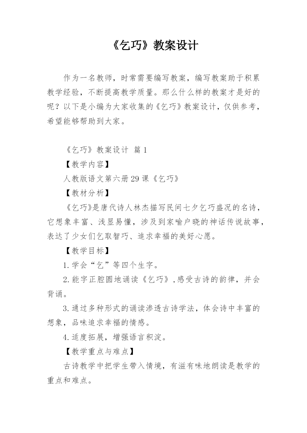 《乞巧》教案设计作为一名教师,时常需要编写教案,编写教案助于积累教学经验,不断提高教学质量。那么什么样的教案才是好的呢?以下是小编为大家收集的《乞巧》教案设计,仅供参考,希望能够帮助到大家。《乞巧》教案设计篇1【教学内容】人教版语文第六册29课《乞巧》【教材分析】《乞巧》是唐代诗人林杰描写民间七夕乞巧盛况的名诗,它想象丰富、浅显易懂,涉及到家喻户晓的神话传说故事,表达了少女们乞取智巧、追求幸福的美好心愿。【教学目标】1.学会“乞”等四个生字。2.能字正腔圆地诵读《乞巧》,感受古诗的韵律,并会背诵。3.通过