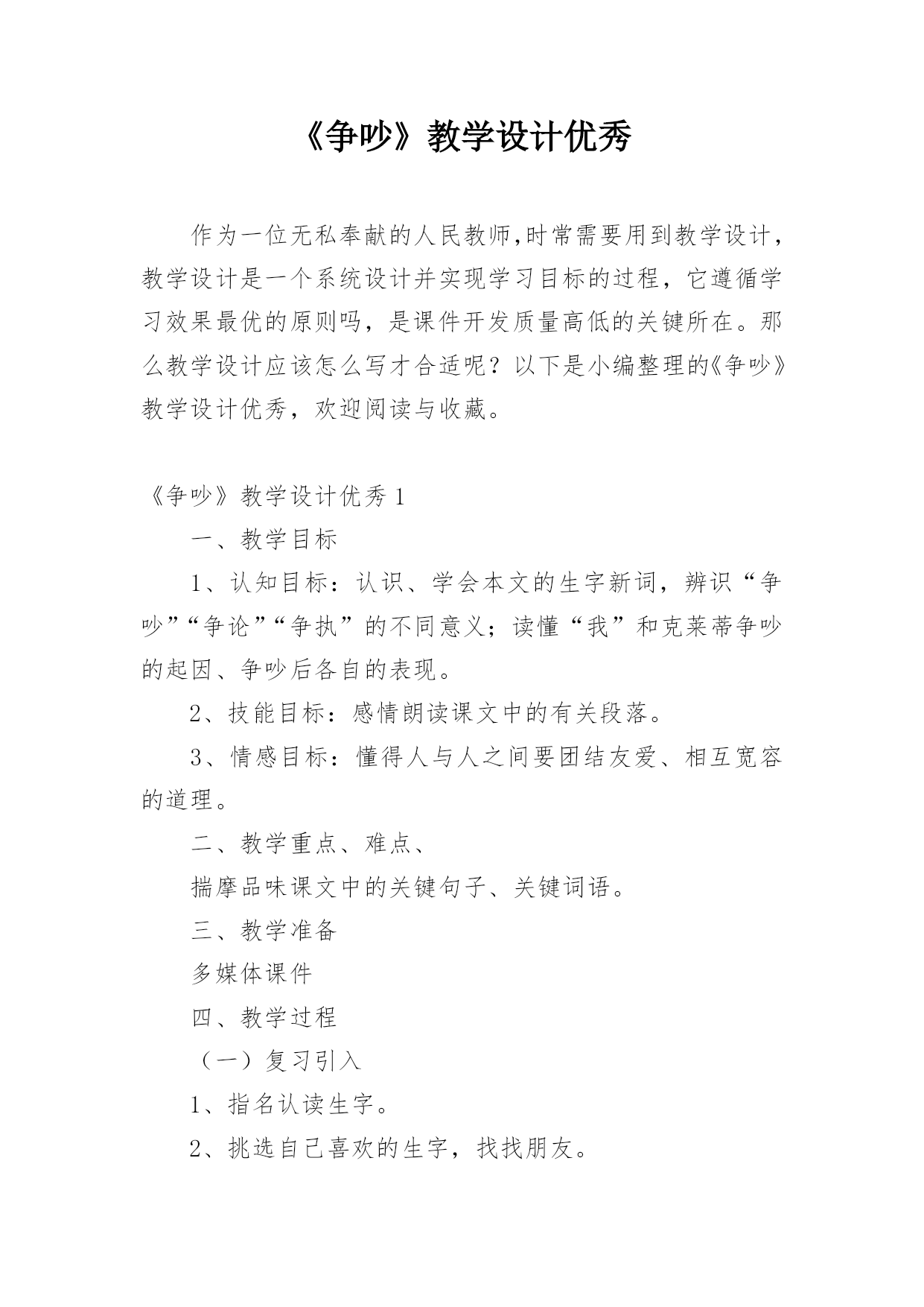 《争吵》教学设计优秀作为一位无私奉献的人民教师,时常需要用到教学设计,教学设计是一个系统设计并实现学习目标的过程,它遵循学习效果最优的原则吗,是课件开发质量高低的关键所在。那么教学设计应该怎么写才合适呢?以下是小编整理的《争吵》教学设计优秀,欢迎阅读与收藏。《争吵》教学设计优秀1一、教学目标1、认知目标:认识、学会本文的生字新词,辨识“争吵”“争论”“争执”的不同意义;读懂“我”和克莱蒂争吵的起因、争吵后各自的表现。2、技能目标:感情朗读课文中的有关段落。3、情感目标:懂得人与人之间要团结友爱、相互宽容的