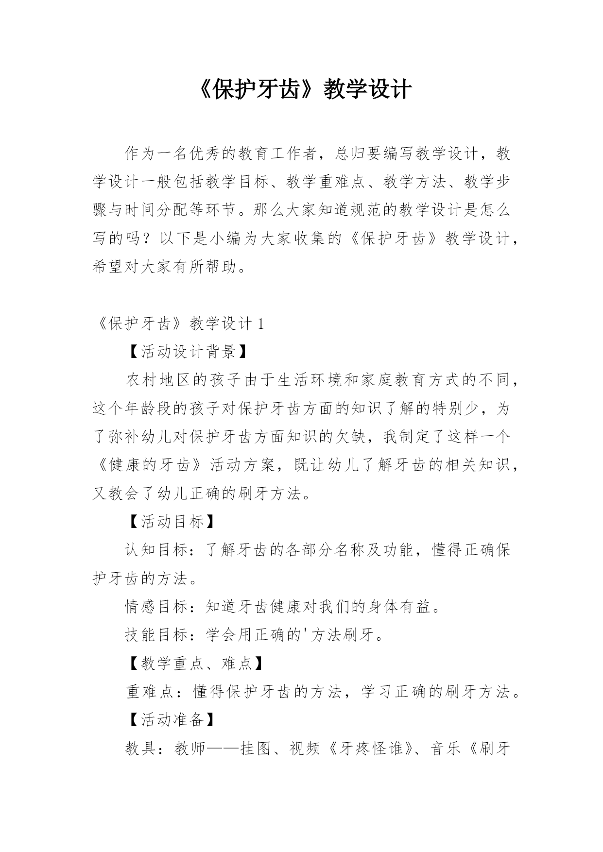 《保护牙齿》教学设计作为一名优秀的教育工作者,总归要编写教学设计,教学设计一般包括教学目标、教学重难点、教学方法、教学步骤与时间分配等环节。那么大家知道规范的教学设计是怎么写的吗?以下是小编为大家收集的《保护牙齿》教学设计,希望对大家有所帮助。《保护牙齿》教学设计1【活动设计背景】农村地区的孩子由于生活环境和家庭教育方式的不同,这个年龄段的孩子对保护牙齿方面的知识了解的特别少,为了弥补幼儿对保护牙齿方面知识的欠缺,我制定了这样一个《健康的牙齿》活动方案,既让幼儿了解牙齿的相关知识,又教会了幼儿正确的刷牙方