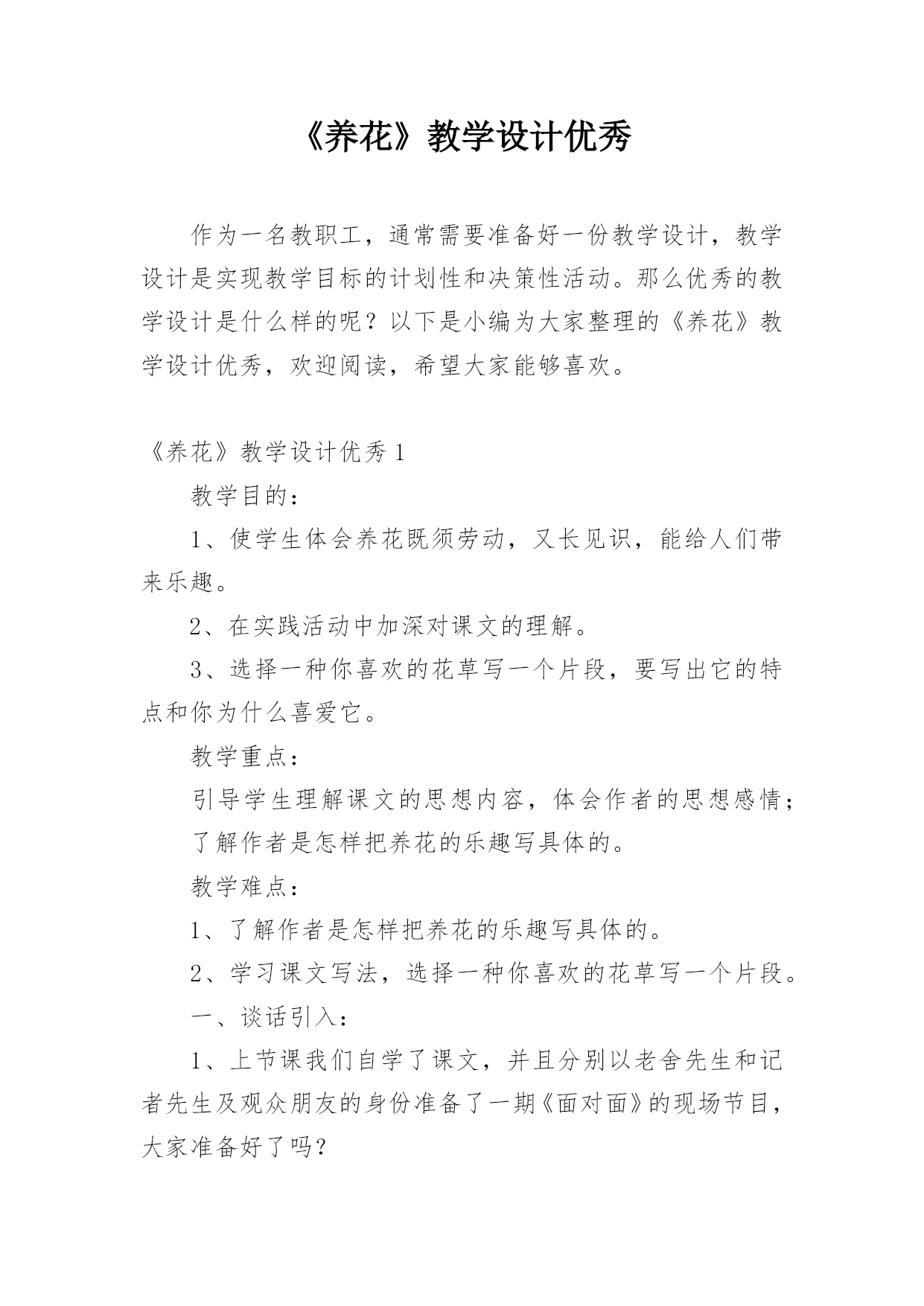 《养花》教学设计优秀作为一名教职工,通常需要准备好一份教学设计,教学设计是实现教学目标的计划性和决策性活动。那么优秀的教学设计是什么样的呢?以下是小编为大家整理的《养花》教学设计优秀,欢迎阅读,希望大家能够喜欢。《养花》教学设计优秀1教学目的:1、使学生体会养花既须劳动,又长见识,能给人们带来乐趣。2、在实践活动中加深对课文的理解。3、选择一种你喜欢的花草写一个片段,要写出它的特点和你为什么喜爱它。教学重点:引导学生理解课文的思想内容,体会作者的思想感情;了解作者是怎样把养花的乐趣写具体的。教学难点:1、