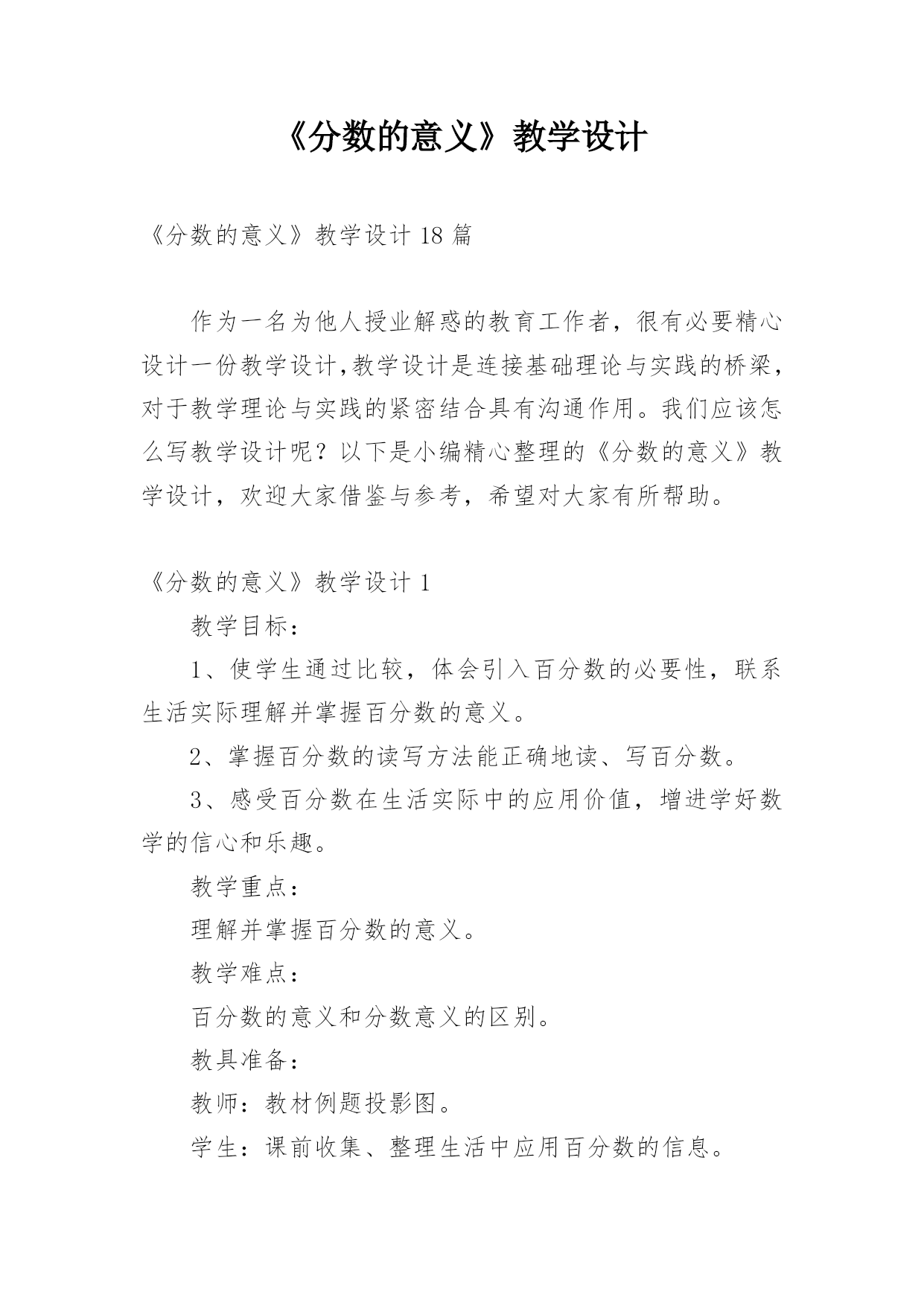 《分数的意义》教学设计《分数的意义》教学设计18篇作为一名为他人授业解惑的教育工作者,很有必要精心设计一份教学设计,教学设计是连接基础理论与实践的桥梁,对于教学理论与实践的紧密结合具有沟通作用。我们应该怎么写教学设计呢?以下是小编精心整理的《分数的意义》教学设计,欢迎大家借鉴与参考,希望对大家有所帮助。《分数的意义》教学设计1教学目标:1、使学生通过比较,体会引入百分数的必要性,联系生活实际理解并掌握百分数的意义。2、掌握百分数的读写方法能正确地读、写百分数。3、感受百分数在生活实际中的应用价值,增进学好