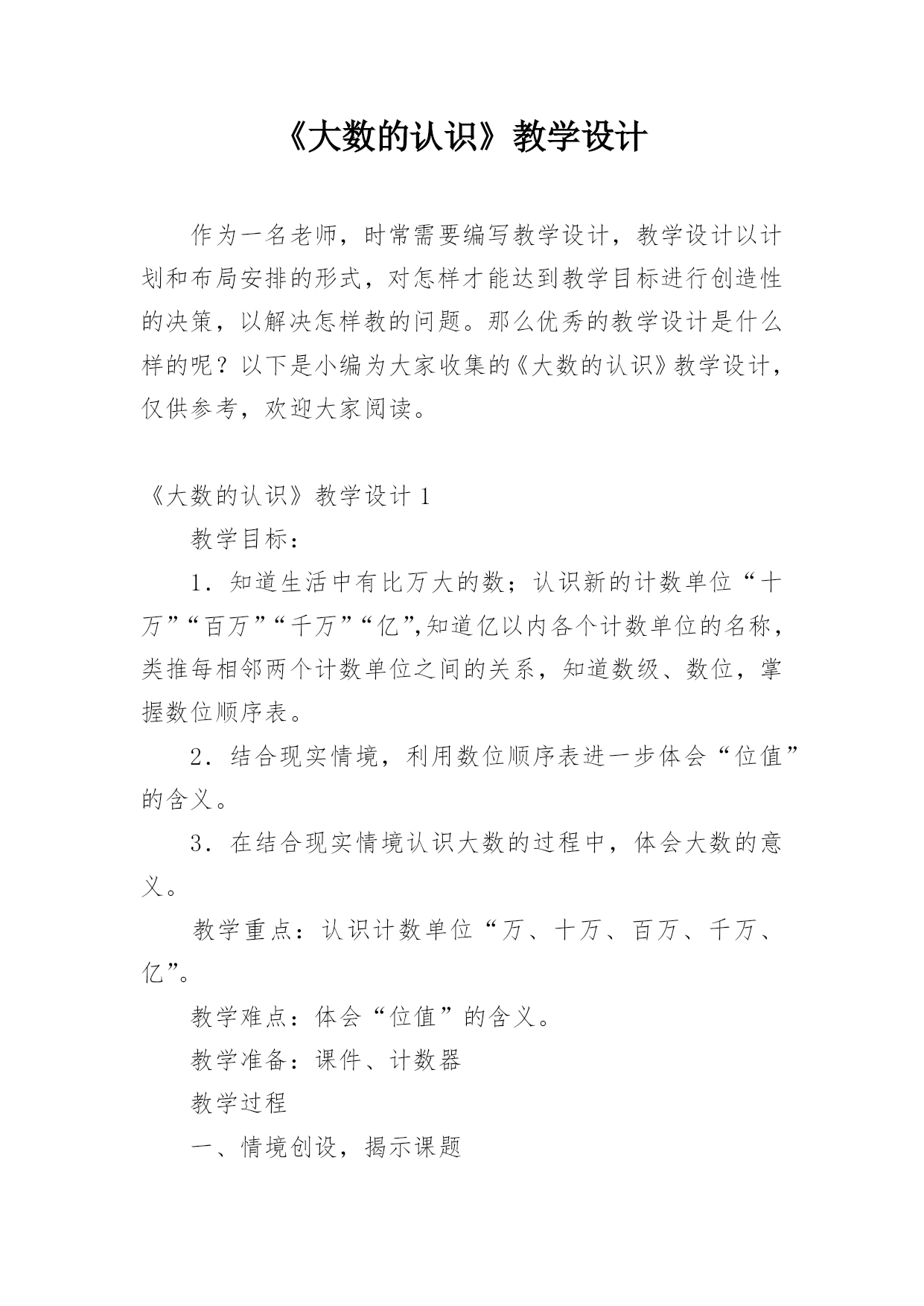 《大数的认识》教学设计作为一名老师,时常需要编写教学设计,教学设计以计划和布局安排的形式,对怎样才能达到教学目标进行创造性的决策,以解决怎样教的问题。那么优秀的教学设计是什么样的呢?以下是小编为大家收集的《大数的认识》教学设计,仅供参考,欢迎大家阅读。《大数的认识》教学设计1教学目标:1.知道生活中有比万大的数;认识新的计数单位“十万”“百万”“千万”“亿”,知道亿以内各个计数单位的名称,类推每相邻两个计数单位之间的关系,知道数级、数位,掌握数位顺序表。2.结合现实情境,利用数位顺序表进一步体会“位值”的