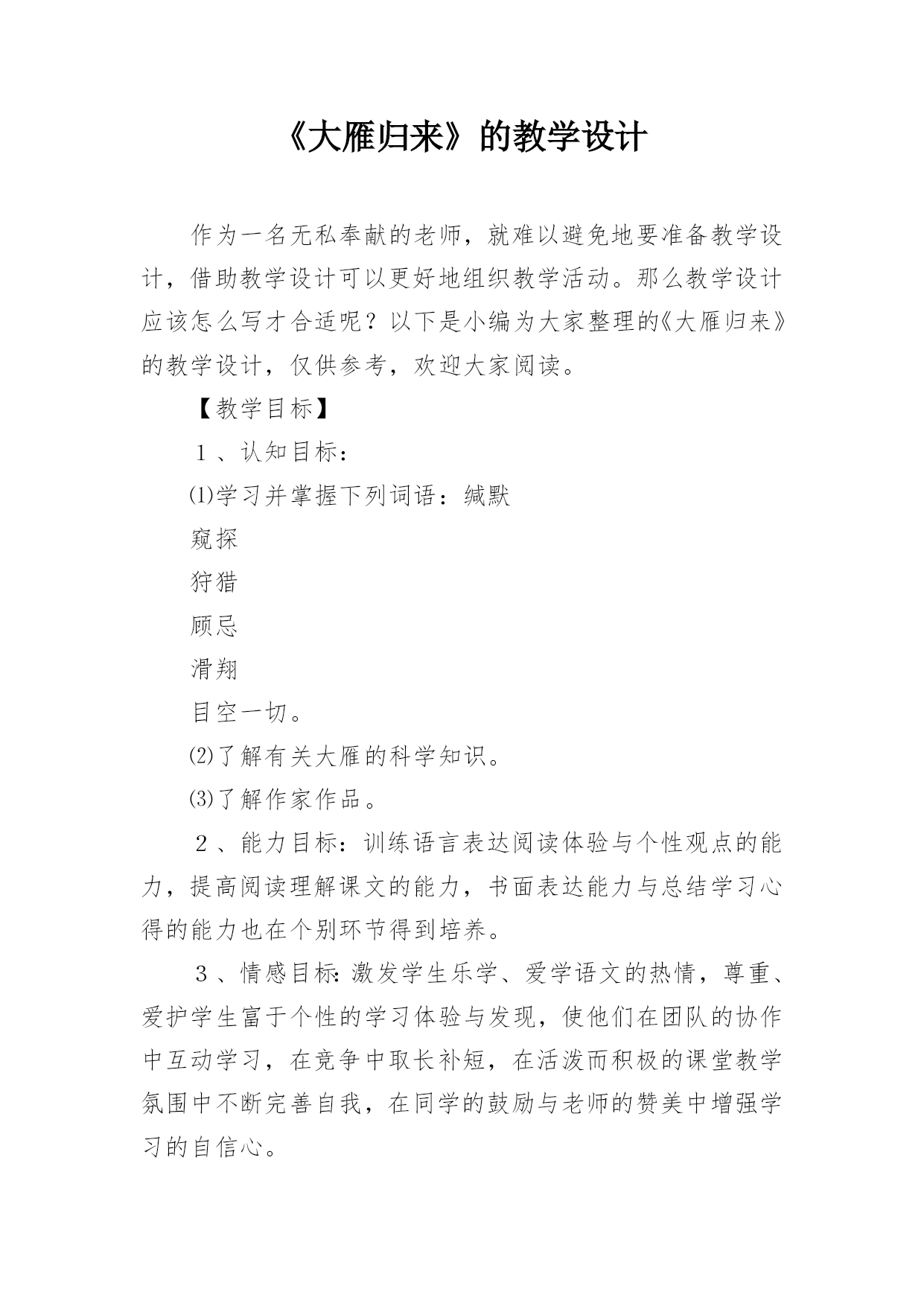 《大雁归来》的教学设计作为一名无私奉献的老师,就难以避免地要准备教学设计,借助教学设计可以更好地组织教学活动。那么教学设计应该怎么写才合适呢?以下是小编为大家整理的《大雁归来》的教学设计,仅供参考,欢迎大家阅读。【教学目标】1、认知目标:⑴学习并掌握下列词语:缄默窥探狩猎顾忌滑翔目空一切。⑵了解有关大雁的科学知识。⑶了解作家作品。2、能力目标:训练语言表达阅读体验与个性观点的能力,提高阅读理解课文的能力,书面表达能力与总结学习心得的能力也在个别环节得到培养。3、情感目标:激发学生乐学、爱学语文的热情,尊重