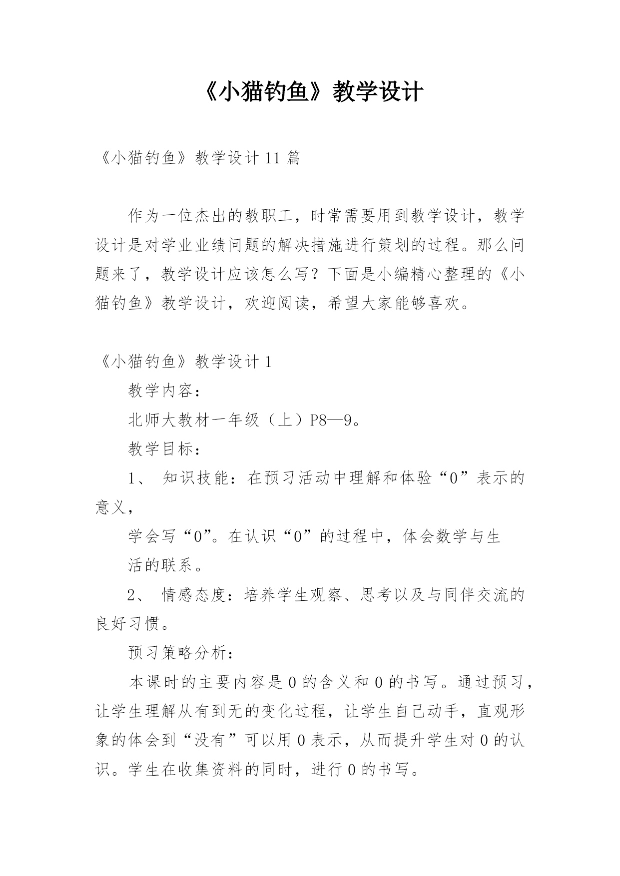 《小猫钓鱼》教学设计《小猫钓鱼》教学设计11篇作为一位杰出的教职工,时常需要用到教学设计,教学设计是对学业业绩问题的解决措施进行策划的过程。那么问题来了,教学设计应该怎么写?下面是小编精心整理的《小猫钓鱼》教学设计,欢迎阅读,希望大家能够喜欢。《小猫钓鱼》教学设计1教学内容:北师大教材一年级(上)P8—9。教学目标:1、知识技能:在预习活动中理解和体验“0”表示的意义,学会写“0”。在认识“0”的过程中,体会数学与生活的联系。2、情感态度:培养学生观察、思考以及与同伴交流的良好习惯。预习策略分析:本课时的