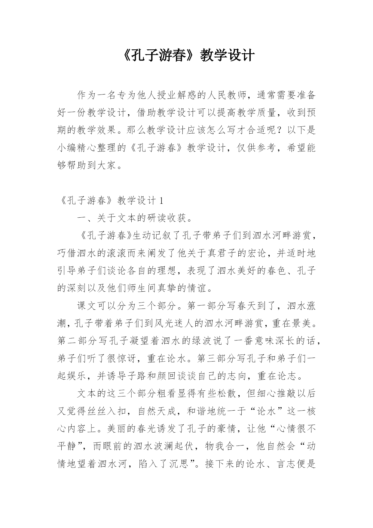 《孔子游春》教学设计作为一名专为他人授业解惑的人民教师,通常需要准备好一份教学设计,借助教学设计可以提高教学质量,收到预期的教学效果。那么教学设计应该怎么写才合适呢?以下是小编精心整理的《孔子游春》教学设计,仅供参考,希望能够帮助到大家。《孔子游春》教学设计1一、关于文本的研读收获。《孔子游春》生动记叙了孔子带弟子们到泗水河畔游赏,巧借泗水的滚滚而来阐发了他关于真君子的宏论,并适时地引导弟子们谈论各自的理想,表现了泗水美好的春色、孔子的深刻以及他们师生间真挚的情谊。课文可以分为三个部分。第一部分写春天到了