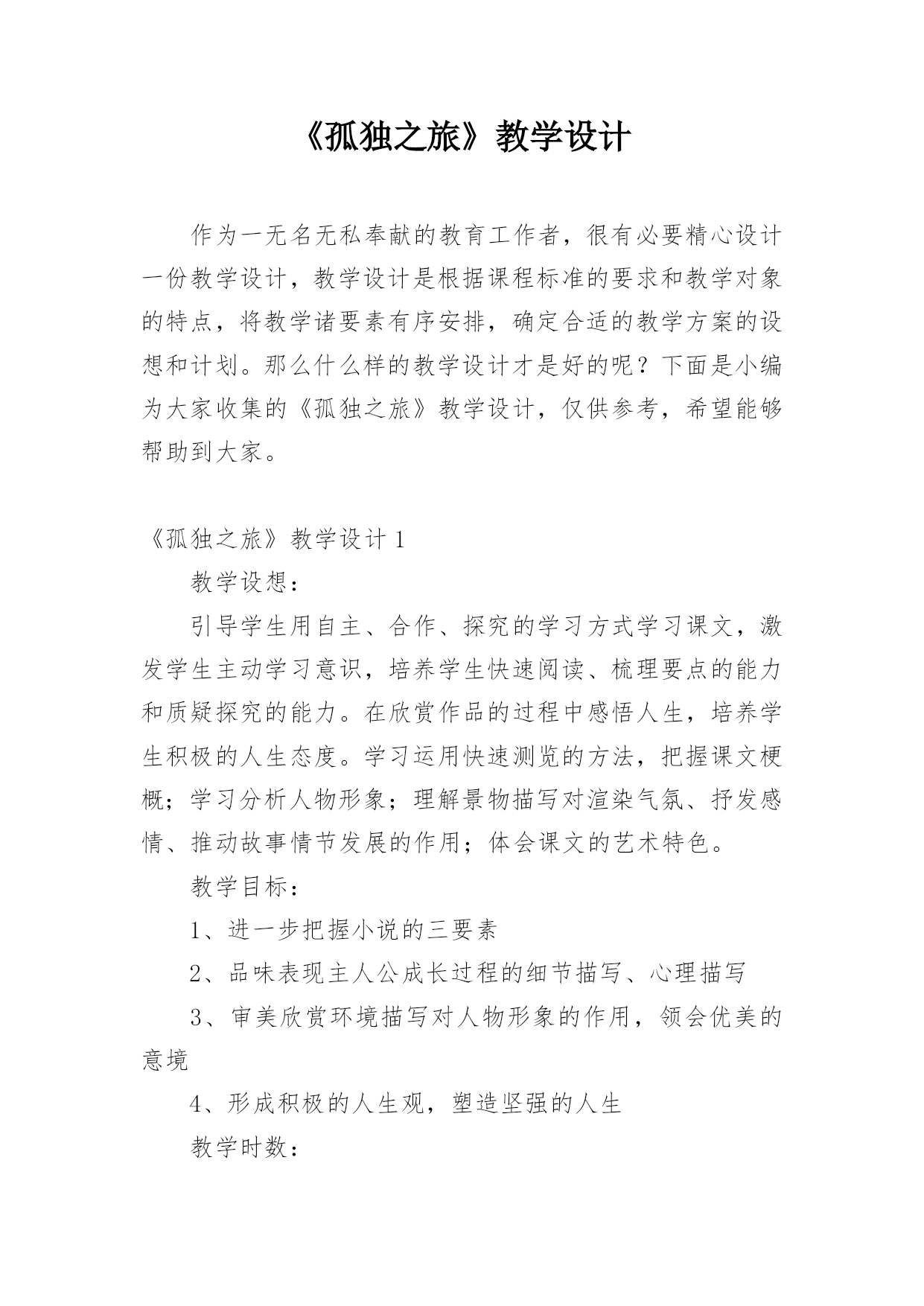 《孤独之旅》教学设计作为一无名无私奉献的教育工作者,很有必要精心设计一份教学设计,教学设计是根据课程标准的要求和教学对象的特点,将教学诸要素有序安排,确定合适的教学方案的设想和计划。那么什么样的教学设计才是好的呢?下面是小编为大家收集的《孤独之旅》教学设计,仅供参考,希望能够帮助到大家。《孤独之旅》教学设计1教学设想:引导学生用自主、合作、探究的学习方式学习课文,激发学生主动学习意识,培养学生快速阅读、梳理要点的能力和质疑探究的能力。在欣赏作品的过程中感悟人生,培养学生积极的人生态度。学习运用快速测览的方