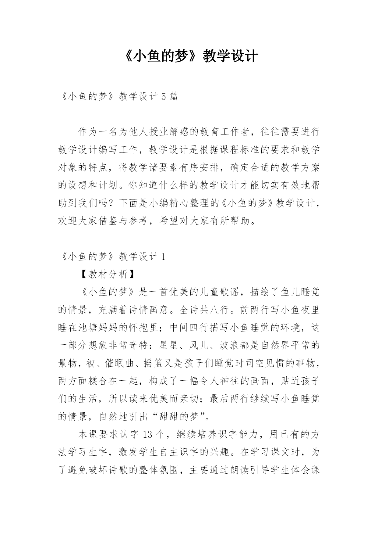 《小鱼的梦》教学设计《小鱼的梦》教学设计5篇作为一名为他人授业解惑的教育工作者,往往需要进行教学设计编写工作,教学设计是根据课程标准的要求和教学对象的特点,将教学诸要素有序安排,确定合适的教学方案的设想和计划。你知道什么样的教学设计才能切实有效地帮助到我们吗?下面是小编精心整理的《小鱼的梦》教学设计,欢迎大家借鉴与参考,希望对大家有所帮助。《小鱼的梦》教学设计1【教材分析】《小鱼的梦》是一首优美的儿童歌谣,描绘了鱼儿睡觉的情景,充满着诗情画意。全诗共八行。前两行写小鱼夜里睡在池塘妈妈的怀抱里;中间四行描写