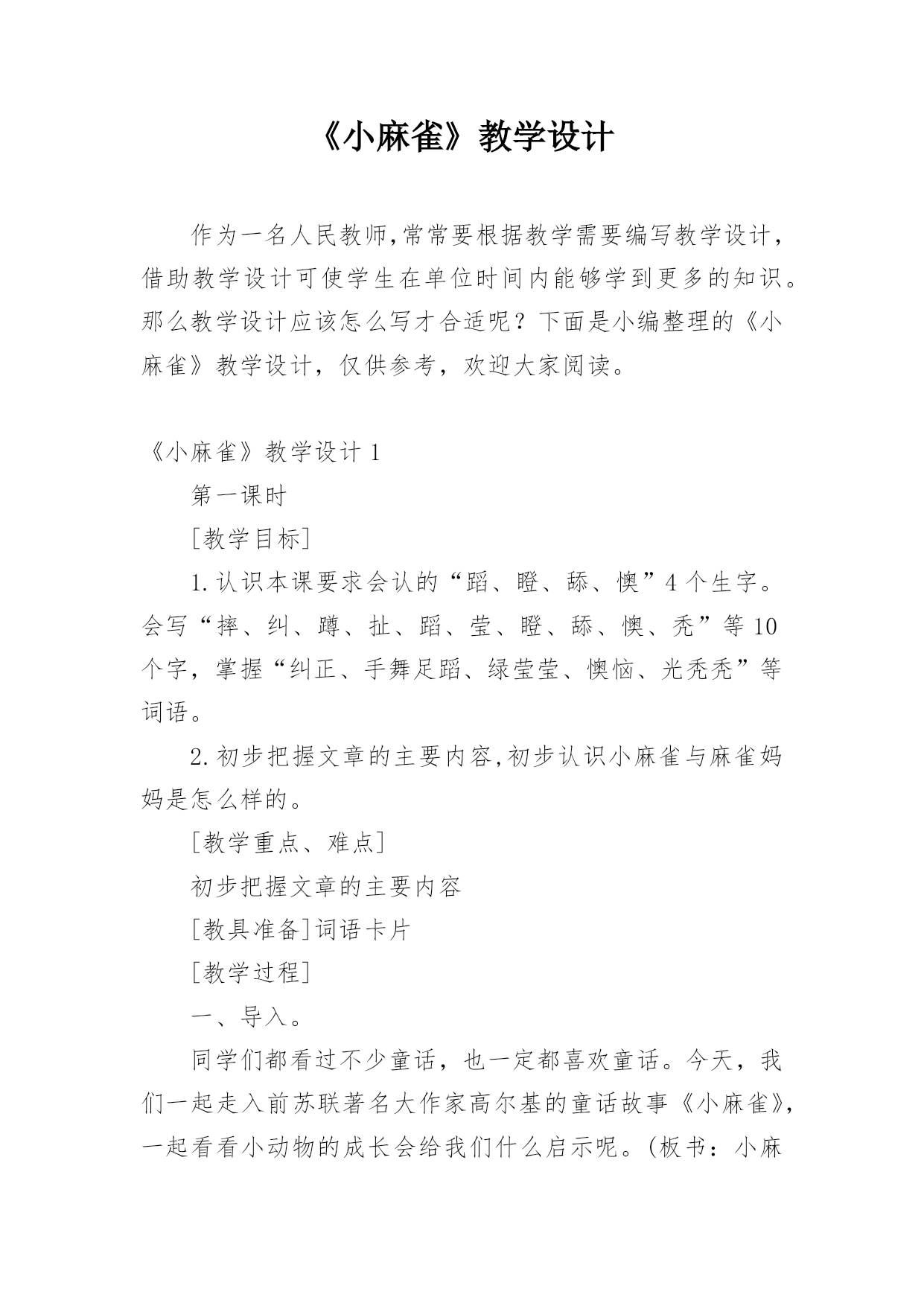 《小麻雀》教学设计作为一名人民教师,常常要根据教学需要编写教学设计,借助教学设计可使学生在单位时间内能够学到更多的知识。那么教学设计应该怎么写才合适呢?下面是小编整理的《小麻雀》教学设计,仅供参考,欢迎大家阅读。《小麻雀》教学设计1第一课时[教学目标]1.认识本课要求会认的“蹈、瞪、舔、懊”4个生字。会写“摔、纠、蹲、扯、蹈、莹、瞪、舔、懊、秃”等10个字,掌握“纠正、手舞足蹈、绿莹莹、懊恼、光秃秃”等词语。2.初步把握文章的主要内容,初步认识小麻雀与麻雀妈妈是怎么样的。[教学重点、难点]初步把握文章的主
