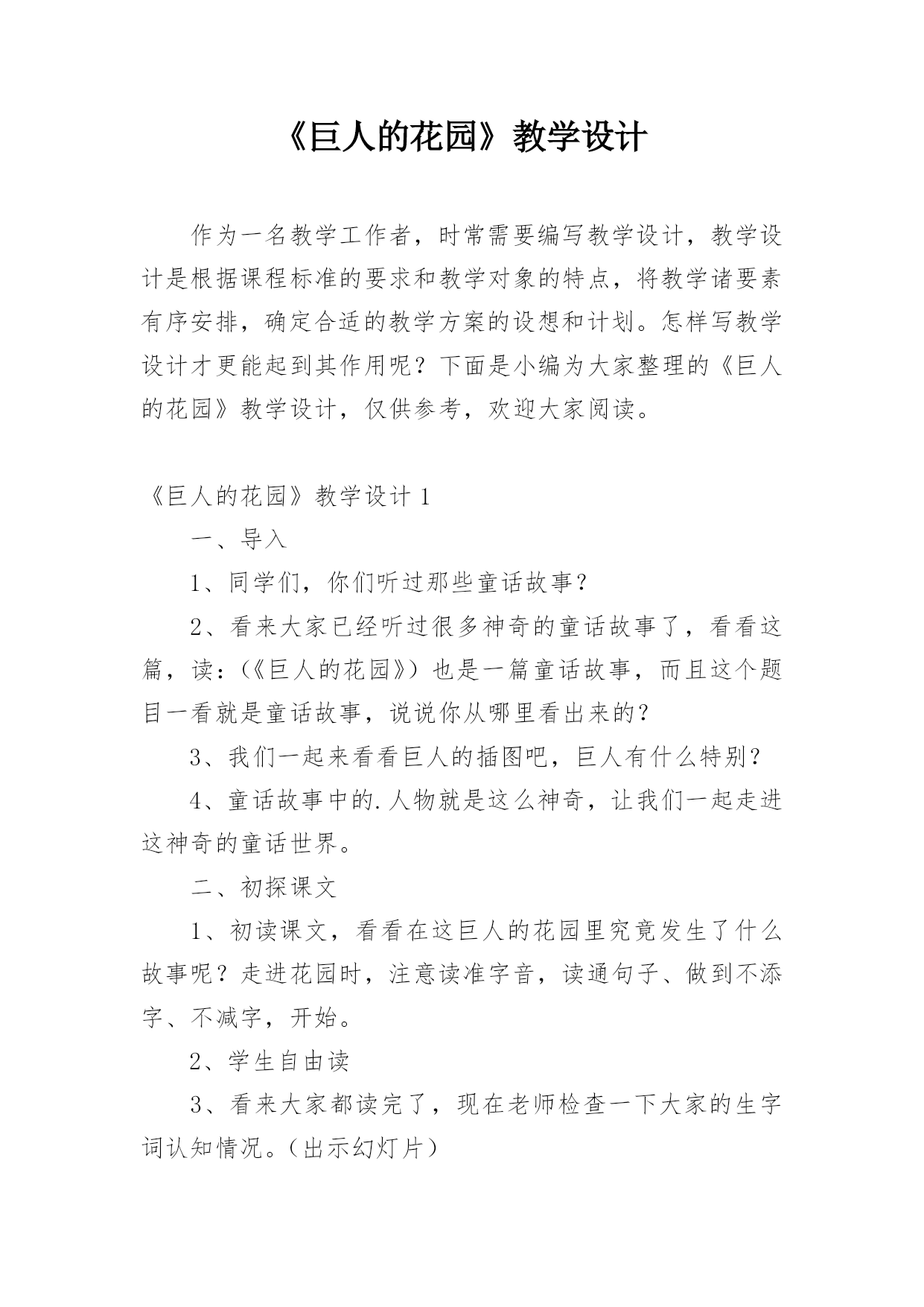 《巨人的花园》教学设计作为一名教学工作者,时常需要编写教学设计,教学设计是根据课程标准的要求和教学对象的特点,将教学诸要素有序安排,确定合适的教学方案的设想和计划。怎样写教学设计才更能起到其作用呢?下面是小编为大家整理的《巨人的花园》教学设计,仅供参考,欢迎大家阅读。《巨人的花园》教学设计1一、导入1、同学们,你们听过那些童话故事?2、看来大家已经听过很多神奇的童话故事了,看看这篇,读:(《巨人的花园》)也是一篇童话故事,而且这个题目一看就是童话故事,说说你从哪里看出来的?3、我们一起来看看巨人的插图吧,