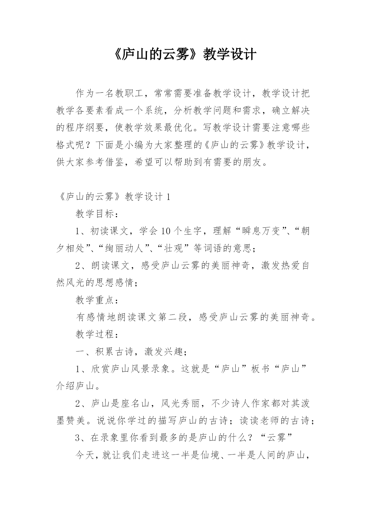 《庐山的云雾》教学设计作为一名教职工,常常需要准备教学设计,教学设计把教学各要素看成一个系统,分析教学问题和需求,确立解决的程序纲要,使教学效果最优化。写教学设计需要注意哪些格式呢?下面是小编为大家整理的《庐山的云雾》教学设计,供大家参考借鉴,希望可以帮助到有需要的朋友。《庐山的云雾》教学设计1教学目标:1、初读课文,学会10个生字,理解“瞬息万变”、“朝夕相处”、“绚丽动人”、“壮观”等词语的意思;2、朗读课文,感受庐山云雾的美丽神奇,激发热爱自然风光的思想感情;教学重点:有感情地朗读课文第二段,感受庐