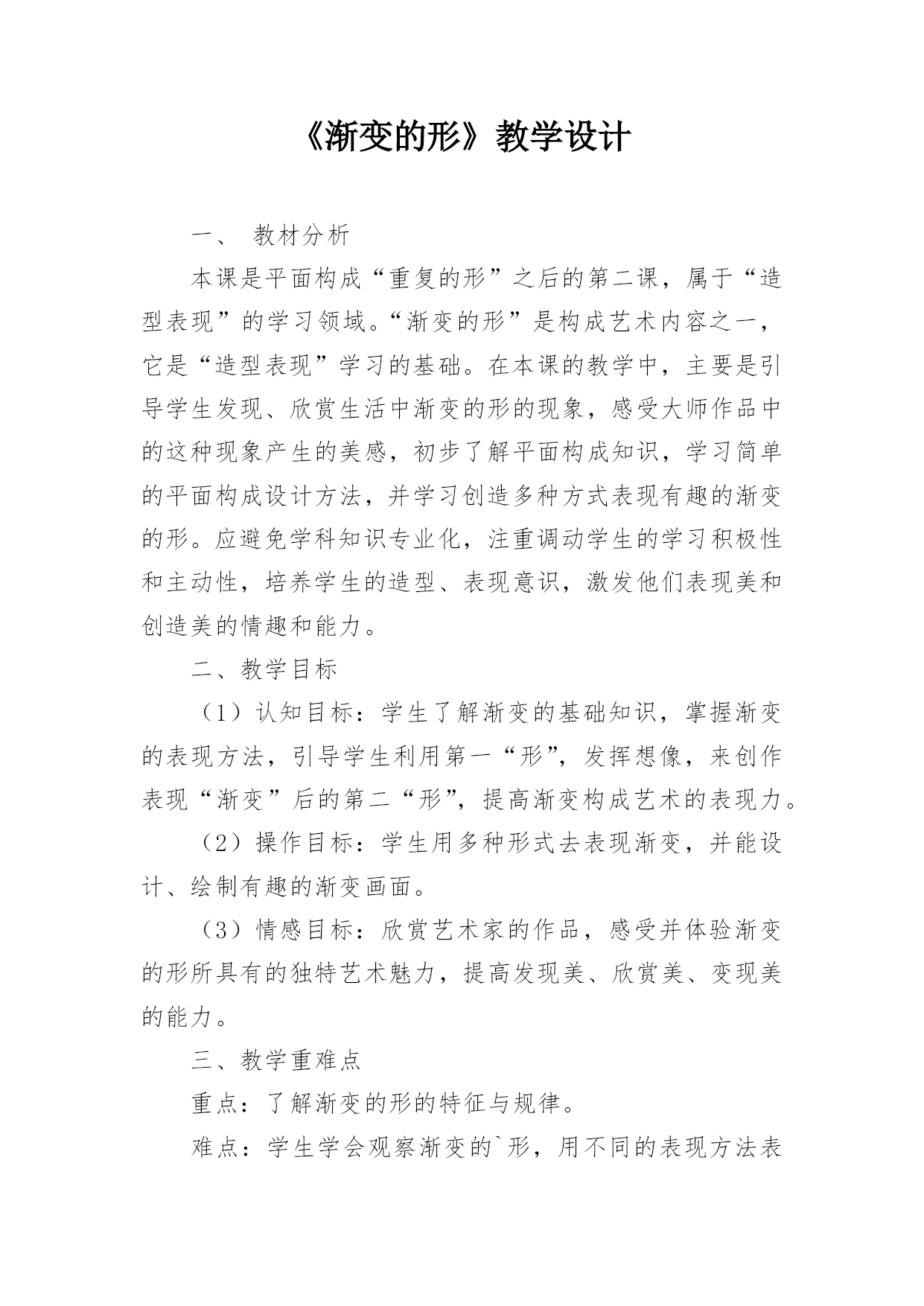 《渐变的形》教学设计一、教材分析本课是平面构成“重复的形”之后的第二课,属于“造型表现”的学习领域。“渐变的形”是构成艺术内容之一,它是“造型表现”学习的基础。在本课的教学中,主要是引导学生发现、欣赏生活中渐变的形的现象,感受大师作品中的这种现象产生的美感,初步了解平面构成知识,学习简单的平面构成设计方法,并学习创造多种方式表现有趣的渐变的形。应避免学科知识专业化,注重调动学生的学习积极性和主动性,培养学生的造型、表现意识,激发他们表现美和创造美的情趣和能力。二、教学目标(1)认知目标:学生了解渐变的基础