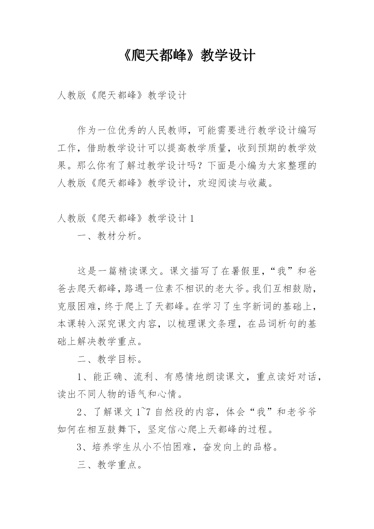 《爬天都峰》教学设计人教版《爬天都峰》教学设计作为一位优秀的人民教师,可能需要进行教学设计编写工作,借助教学设计可以提高教学质量,收到预期的教学效果。那么你有了解过教学设计吗?下面是小编为大家整理的人教版《爬天都峰》教学设计,欢迎阅读与收藏。人教版《爬天都峰》教学设计1一、教材分析。这是一篇精读课文。课文描写了在暑假里,“我”和爸爸去爬天都峰,路遇一位素不相识的老大爷。我们互相鼓励,克服困难,终于爬上了天都峰。在学习了生字新词的基础上,本课转入深究课文内容,以梳理课文条理,在品词析句的基础上解决教学重点。
