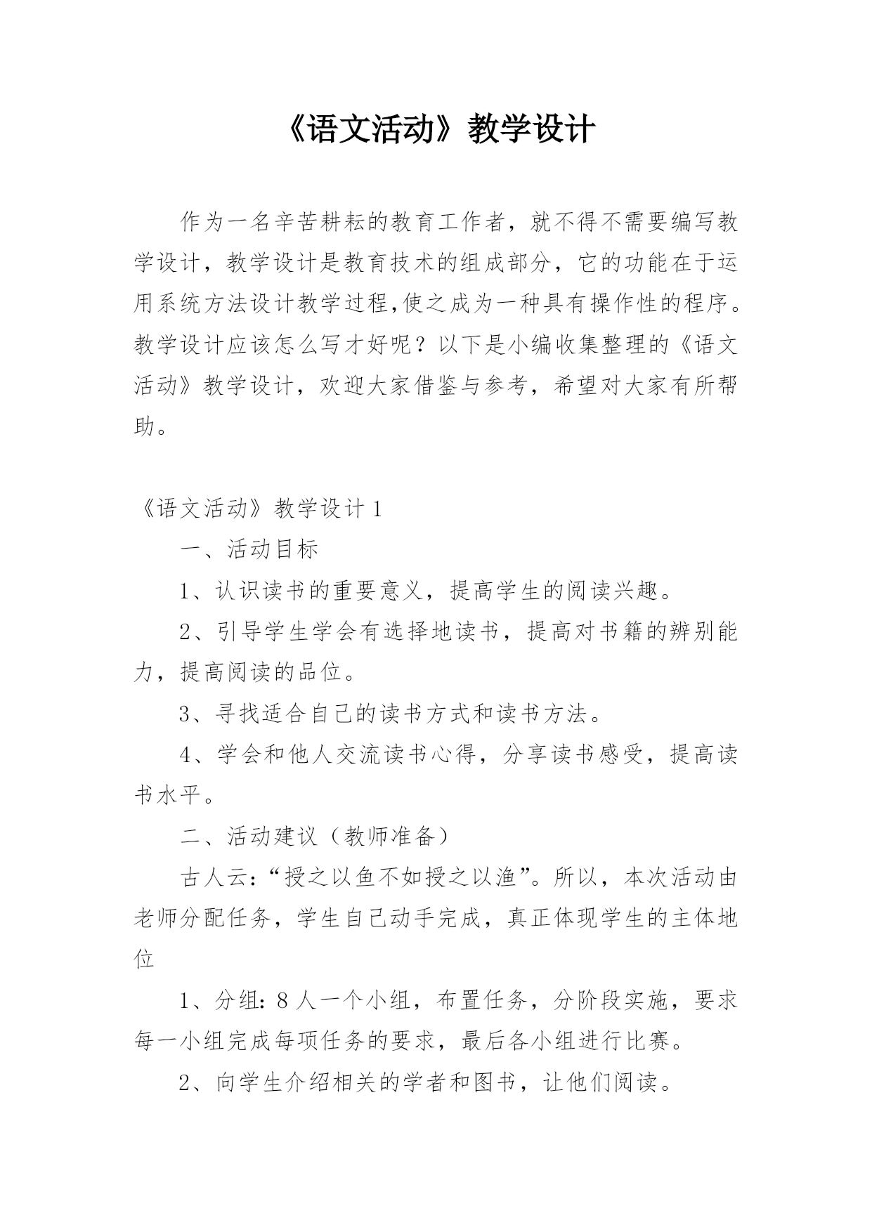 《语文活动》教学设计作为一名辛苦耕耘的教育工作者,就不得不需要编写教学设计,教学设计是教育技术的组成部分,它的功能在于运用系统方法设计教学过程,使之成为一种具有操作性的程序。教学设计应该怎么写才好呢?以下是小编收集整理的《语文活动》教学设计,欢迎大家借鉴与参考,希望对大家有所帮助。《语文活动》教学设计1一、活动目标1、认识读书的重要意义,提高学生的阅读兴趣。2、引导学生学会有选择地读书,提高对书籍的辨别能力,提高阅读的品位。3、寻找适合自己的读书方式和读书方法。4、学会和他人交流读书心得,分享读书感受,提